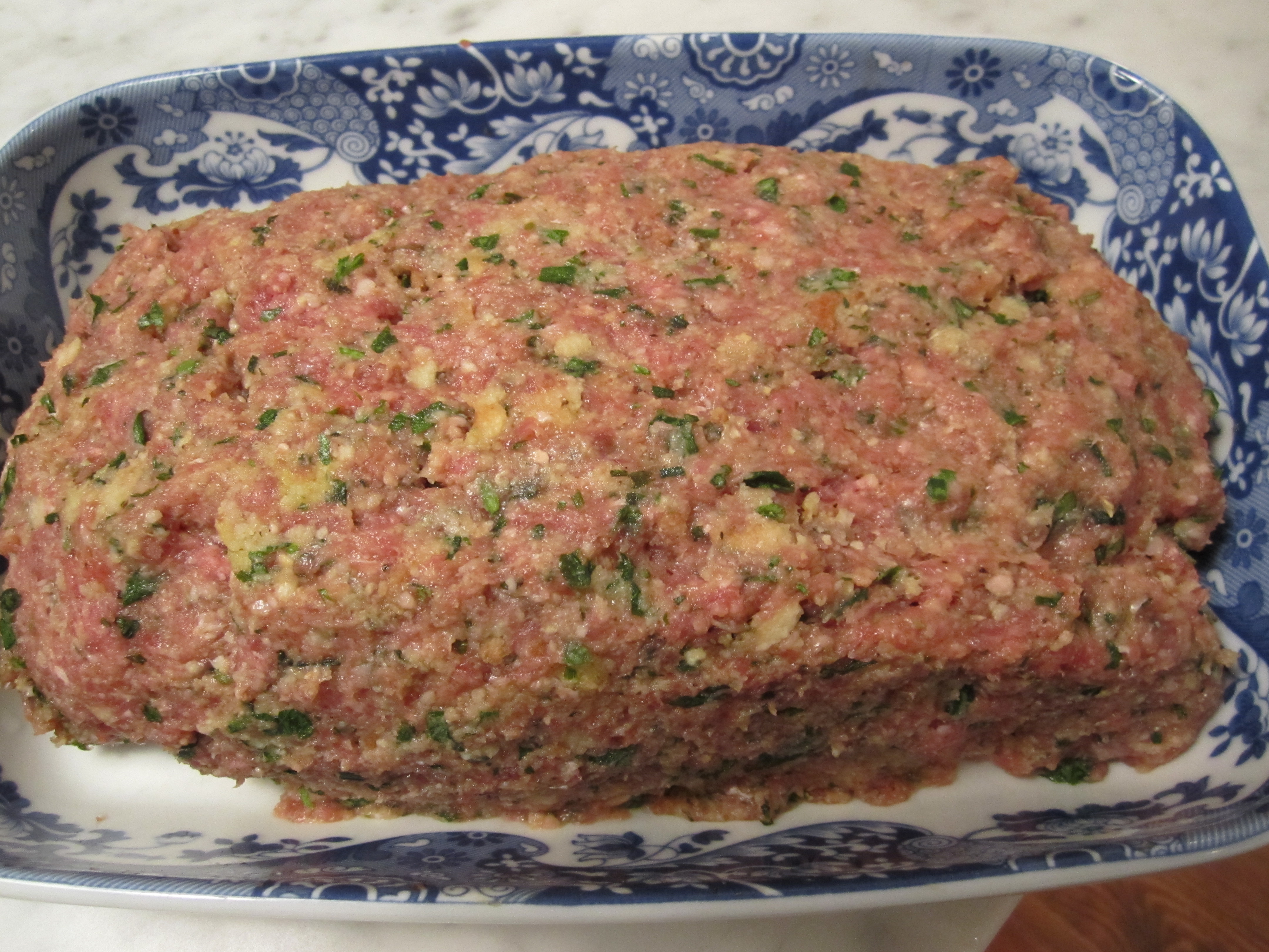 This meatloaf is on the easy side as meatloaves go, because there is no sauteing of aromatics beforehand. The ingredients are simply chopped or pulsed raw in the food processor, then assembled. It can be assembled a couple of hours ahead, held in the fridge, then popped in the oven an hour-and-a-half prior to dinner.