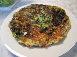 You can vary the filling-to-egg ratio–if I have a lot of vegetables to use up, I use more vegetables and less egg (if I really have a lot of vegetables or am serving a large group, of course, I use a larger skillet and many more eggs).