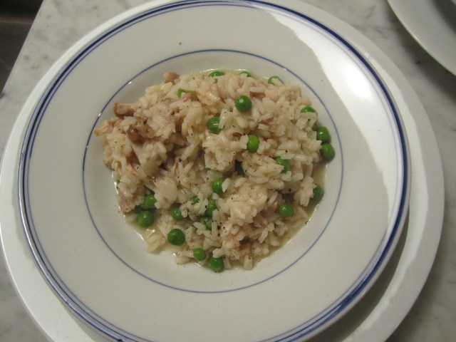 After about ten minutes, add some shredded chicken meat and continue stirring.  At fifteen minutes, add some frozen peas and cover and let sit for five minutes.  Before serving, stir in some more butter and a good amount of grated parmiggiano cheese.  Add a bit more broth to make it as soupy as you want.  Always serve in a warm bowl with more cheese.