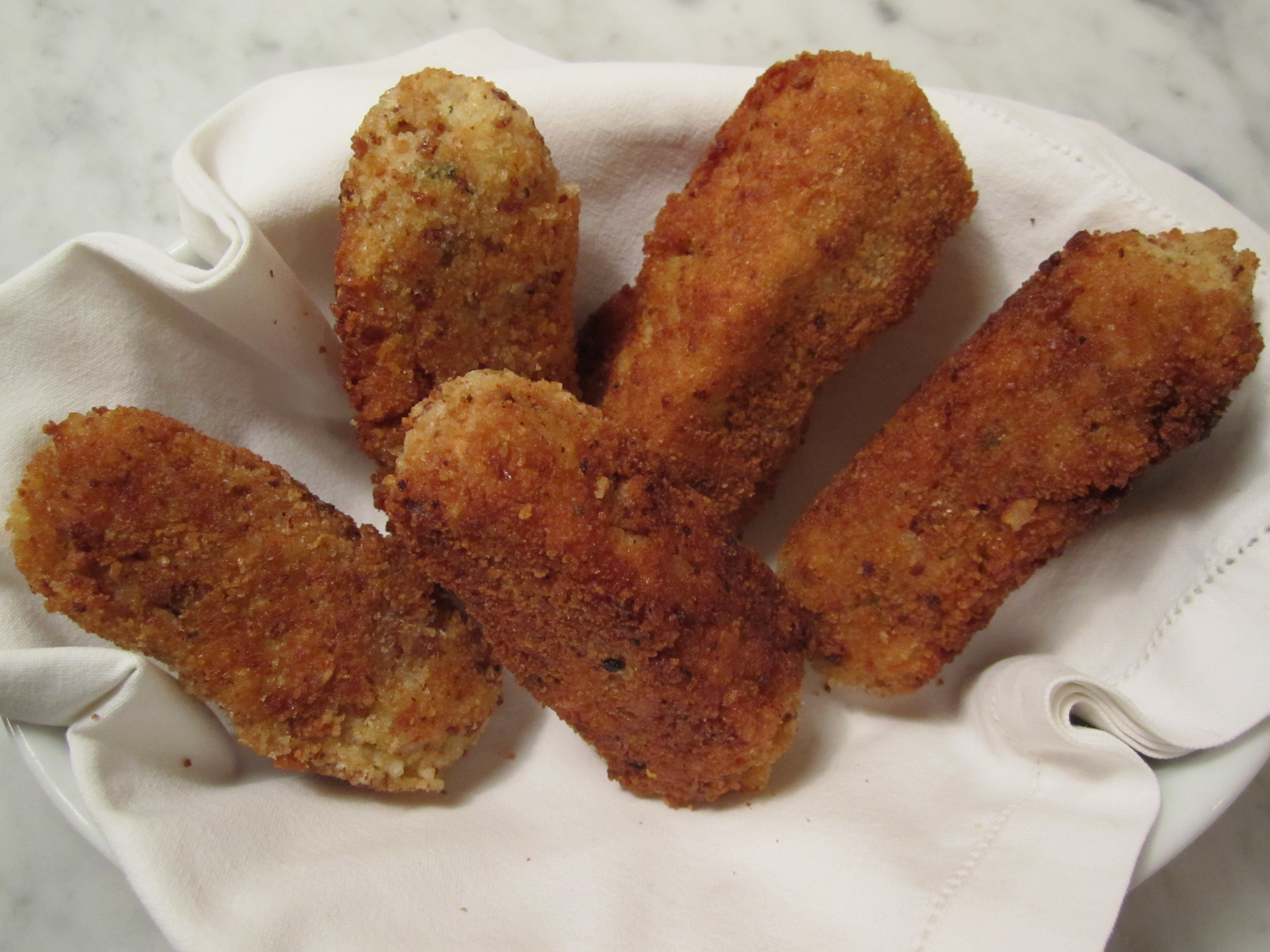 Make little torpedoes of the risotto about 4 or 5 inches long and about 2 inches wide and dip each first in flour (gently knock off the extra flour from each after dredging) then in beaten egg, then roll in crumbs.  Place all on a platter and regrigerate again for at least 15 minutes.