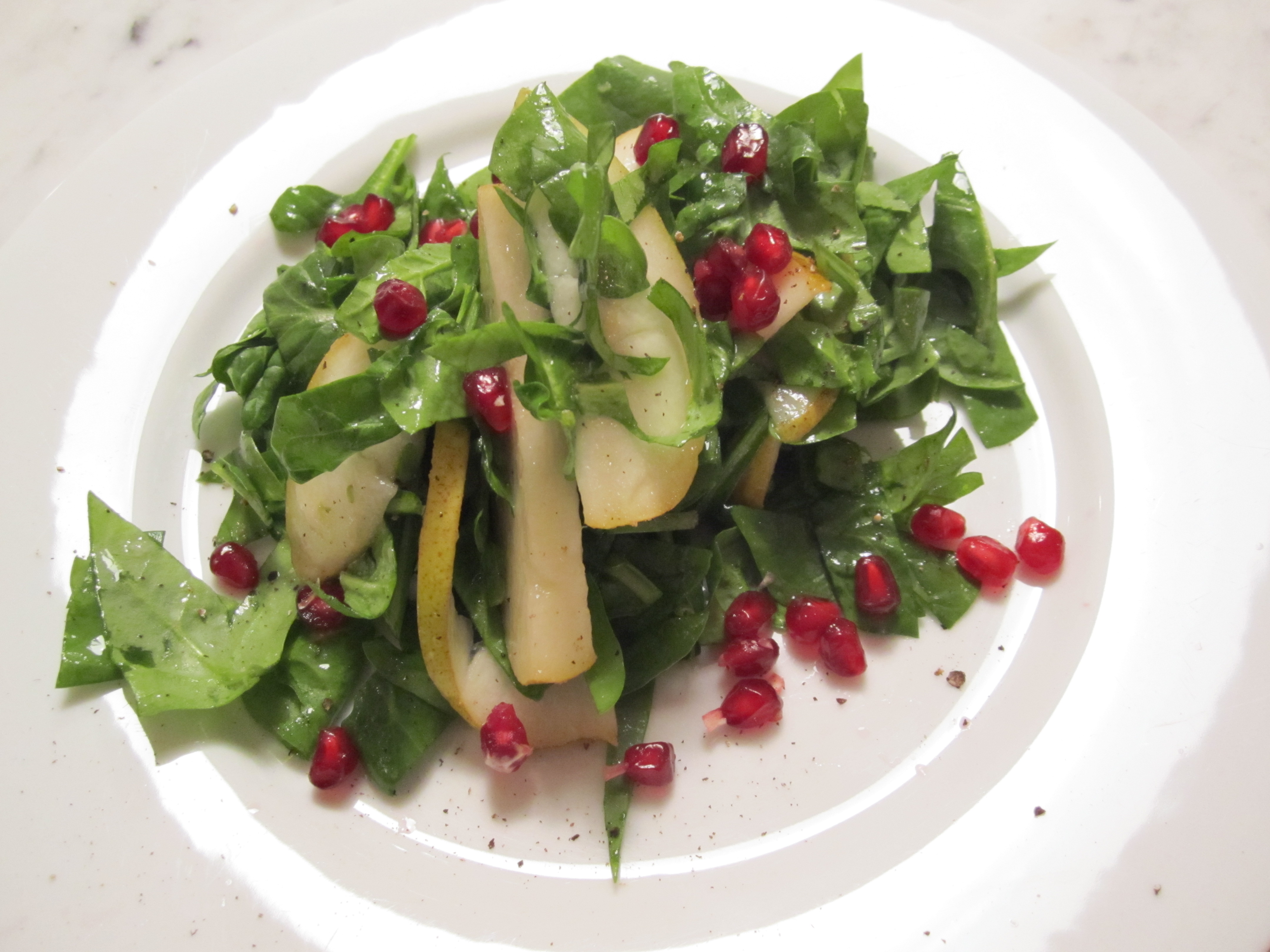 Salad of Baby Spinach, Pears and Pomegranate Seeds