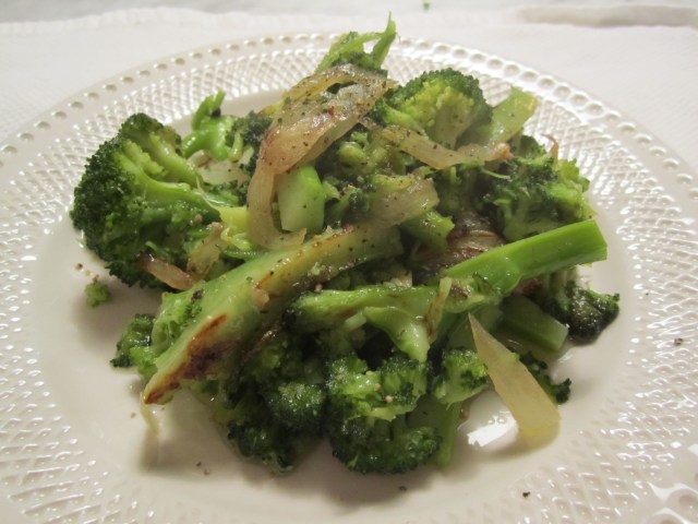 Along with the pasta, I’m making broccoli with onions. Most of us are familiar with broccoli with garlic, but onions are, once again, a sweet counterpoint to broccoli. This is an easy dish, as the broccoli do not need to be boiled before sauteing. Just cook both broccoli and onions together with a splash of water, covered, for about 15 minutes. The broccoli become meltingly tender and the onions give it a great sweetness.