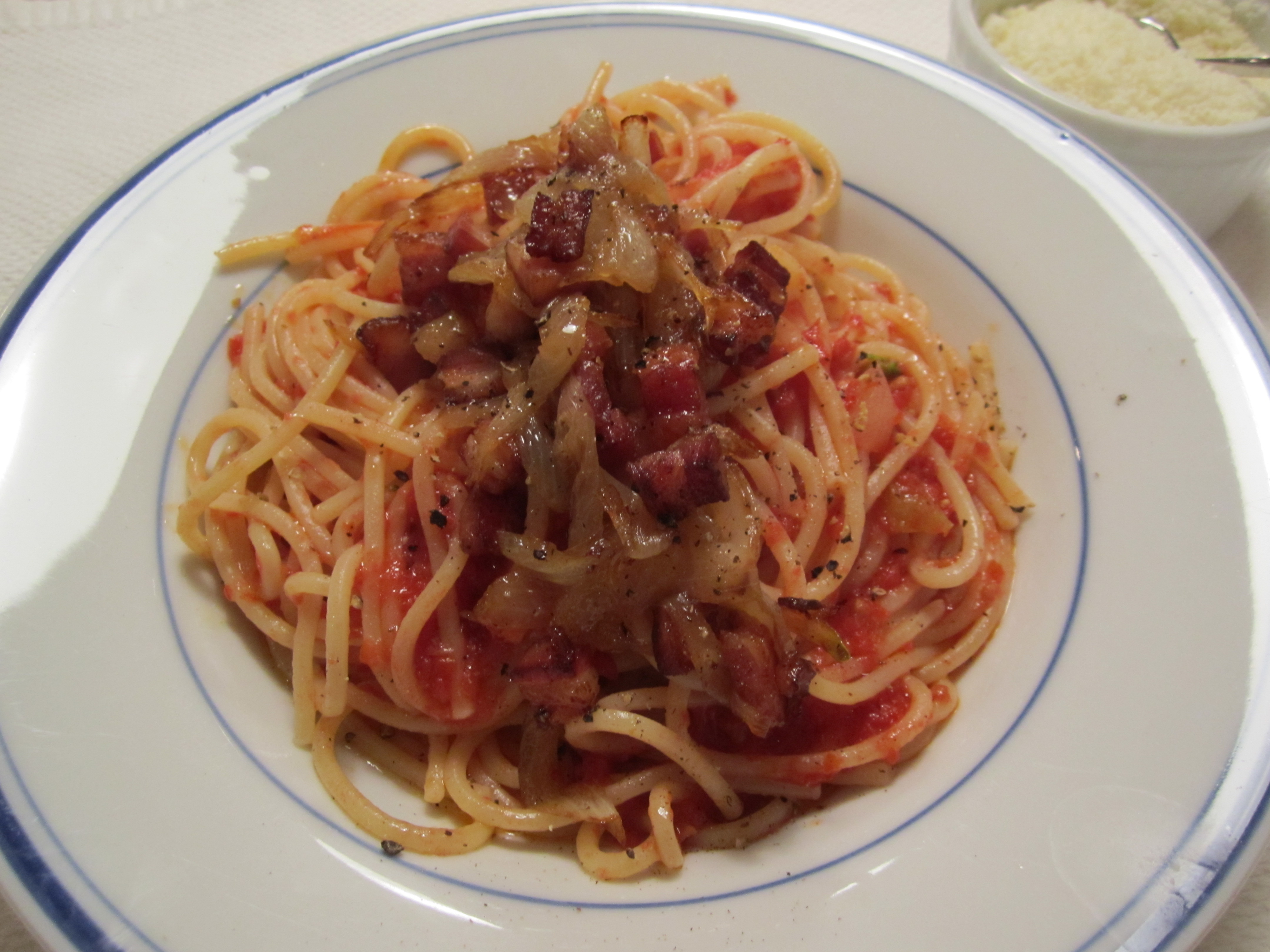 When pasta is about a minute shy of done, toss into a skillet containing about a cup of tomato sauce and add a half-cup of pasta cooking liquid and saute for a minute or so until the pasta and sauce are incorporated. Turn into heated shallow serving bowl and top with bacon/onion mixture, as well as a generous sprinkling of pecorino and black pepper.