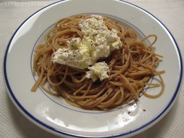 After the meaty meals of the past few evenings, I’m ready to eat meatless tonight. I’m in the mood for whole wheat spaghetti with ricotta.