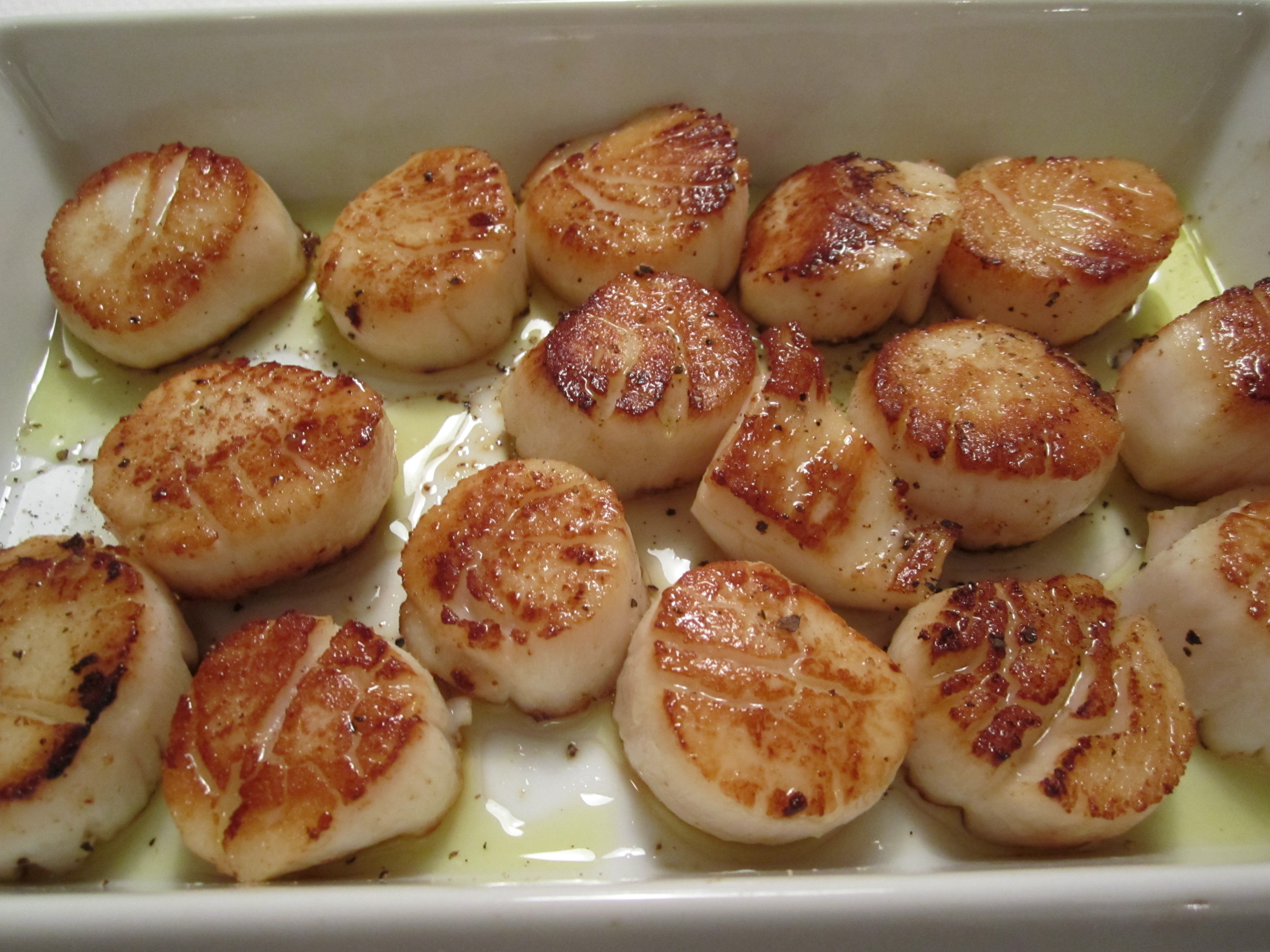Pull the scallops out of the skillet and lay on a serving platter, discarding the cooking oil completely. Once on the serving platter, drizzle the scallops with extra-virgin olive oil and grind fresh black pepper over them. Add a squeeze of lemon, if you like. Serve immediately or eat cold from the fridge the next day.