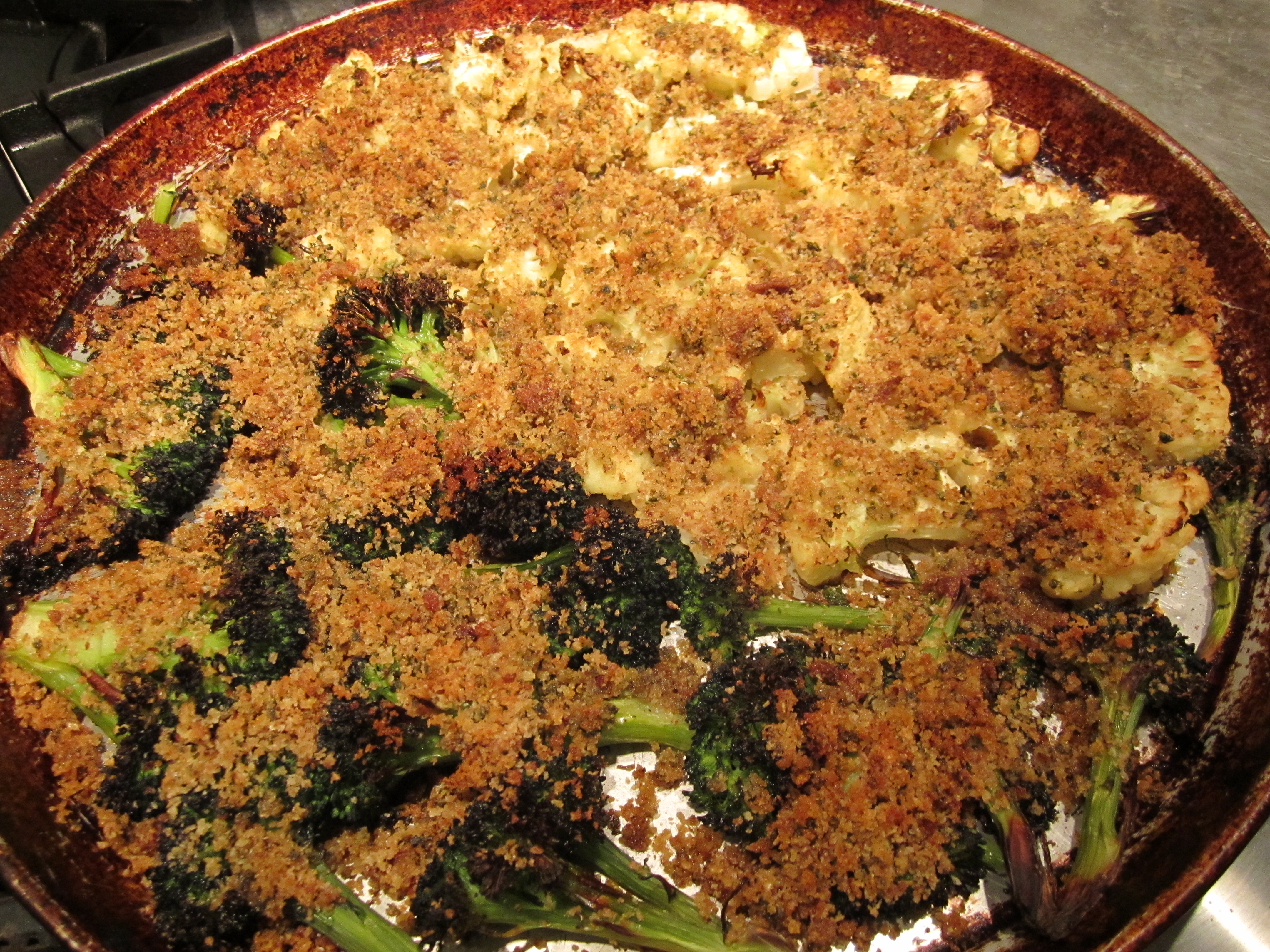 This gratinate is, perhaps a good way to get kids to eat their vegetables. It features broccoli and cauliflower, topped with a crisp and briny breadcrumb topping that would make anything taste appealing.