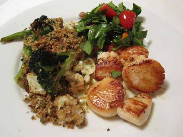 I’m serving the scallops with the broccoli and cauliflower gratinate below, as well as a chopped salad (see my post on olive oil-poached tuna for the recipe). The breadcrumb mixture from the vegetables gets all over and under the scallops and salad and it all tastes wonderful together.