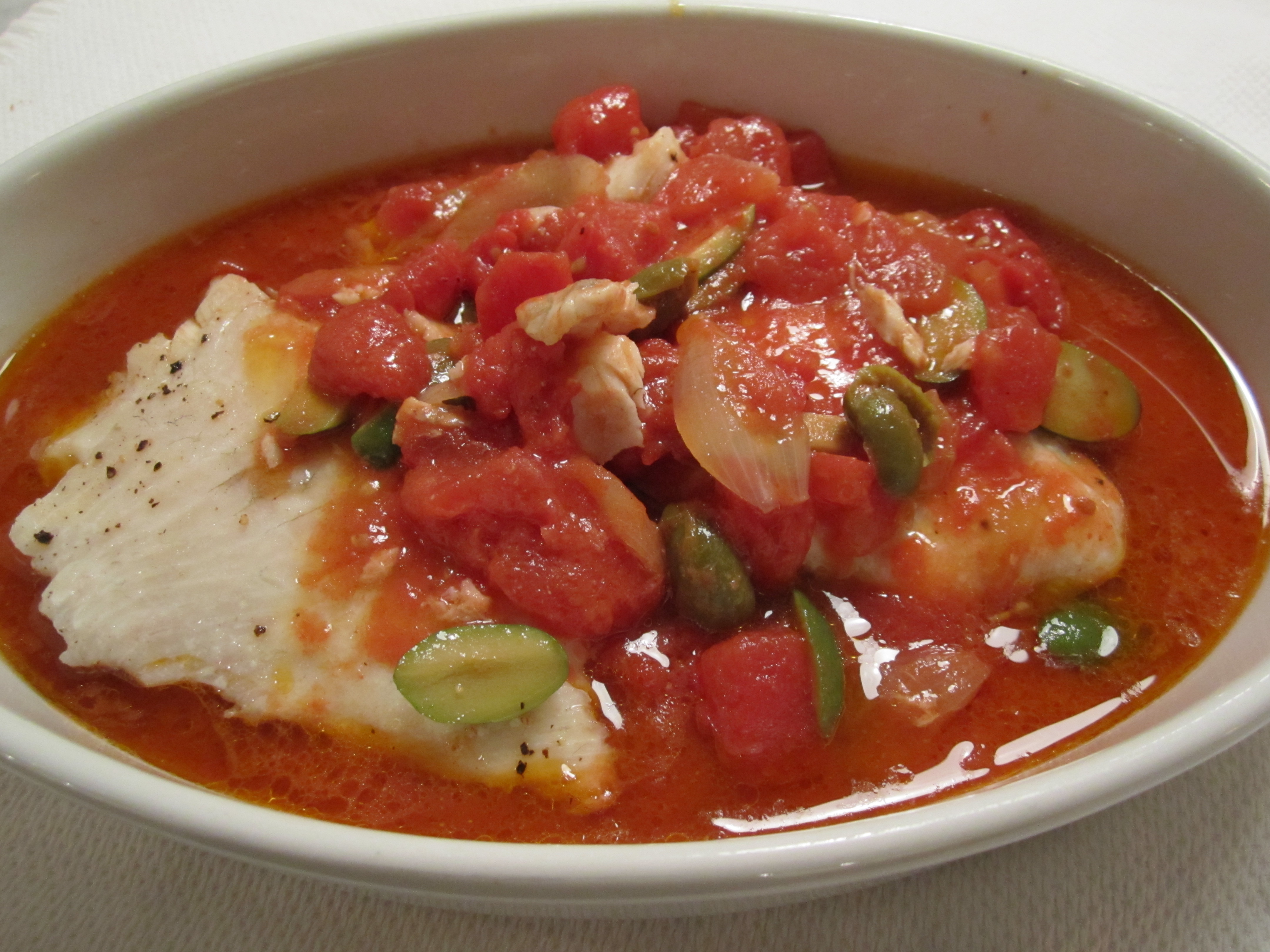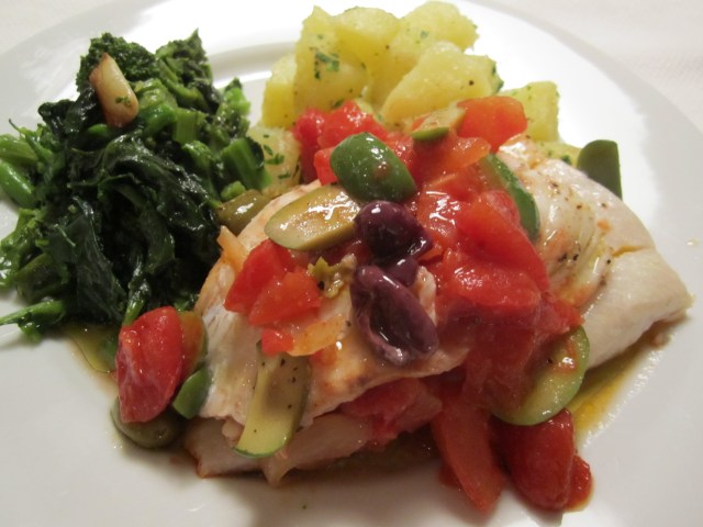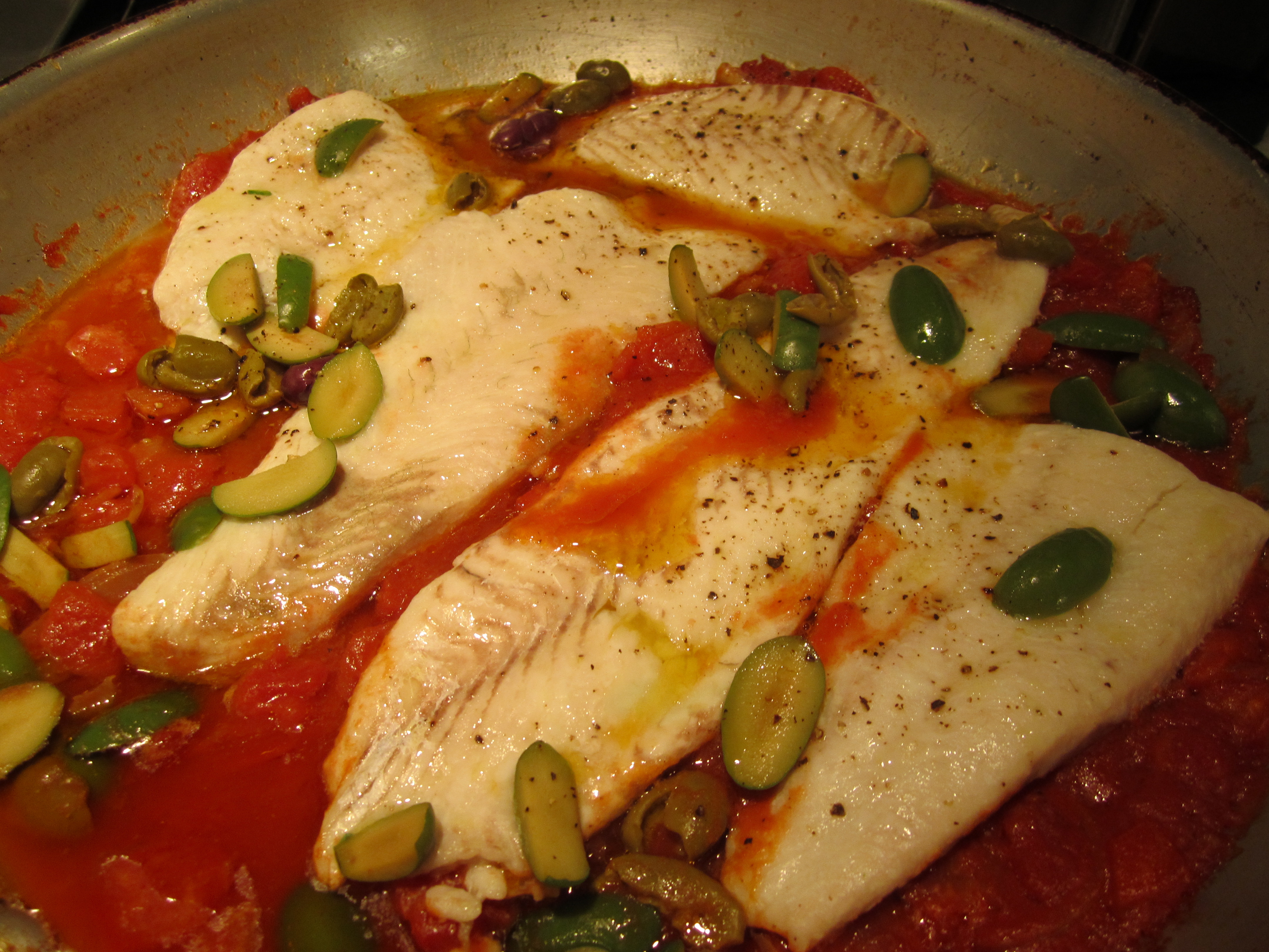 I make the tomato sauce in a broad ovenproof skillet, then after it has simmered for about ten minutes, I add the fish filets on top and nestle them in the sauce. Toss in some olives and place the whole skillet uncovered in a hot oven. The sauce reduces slightly as the fish bakes. When the dish is done, the fish is moist and delicate–essentially poached, and the sauce around it has tightened up a bit.