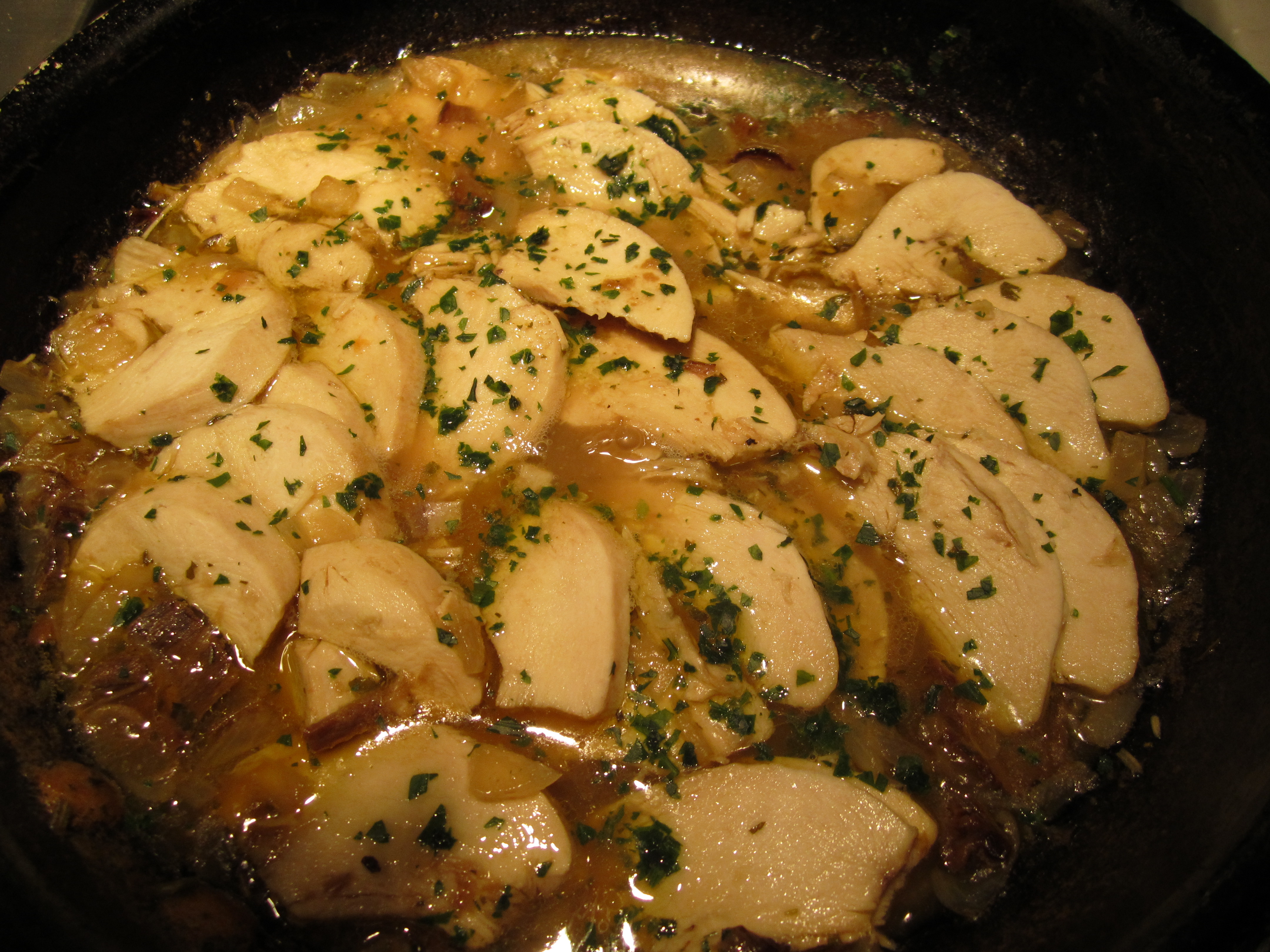 The main lesson in this post is how to improvise an elegant, easy sauce in which to reheat any kind of poultry. The sauce begins with some onions and reconstituted dried porcini sauteed in oil and butter, along with a rosemary sprig. When the vegetables begin to sweat and soften, add a touch of flour and saute until the flour is no longer raw. Then add some white wine and reduce. Then add broth and some of the mushroom soaking liquid and simmer for a short while to allow the flavors to meld.