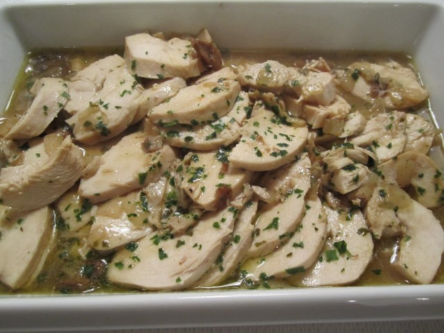That is where the concept of “in umido” comes in. All it means is a “wet” dish. In this case, I’ve made a refined little sauce in which to reheat my sliced chicken breasts. Along with the sauce, I will make some stuffing in the style of my neighbor Beppi (see my prior post “Rotolo di Tacchino”). Instead of stuffing a turkey breast, I’ll simply prepare the stuffing and bake, uncovered in a casserole at 375 degrees for a half-hour.