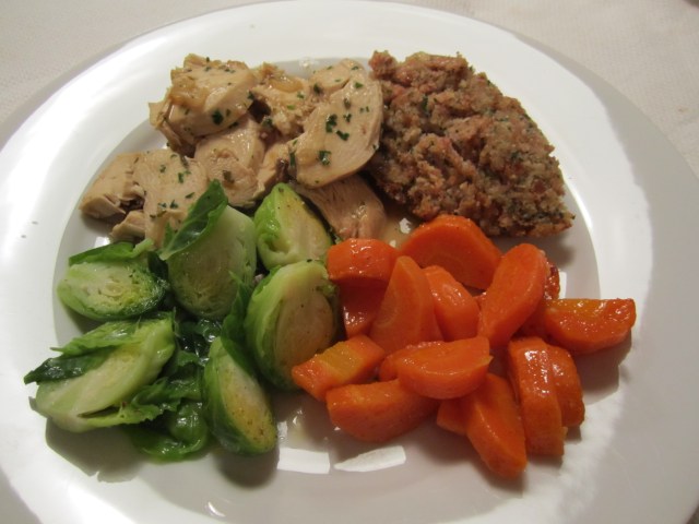 It’s nice to have some mashed potatoes or other mashed root vegetables on the side to soak up the sauce, but in my meal tonight, I’m in the mood for stuffing. On the side, I’m serving some simple boiled brussels sprouts and carrots.