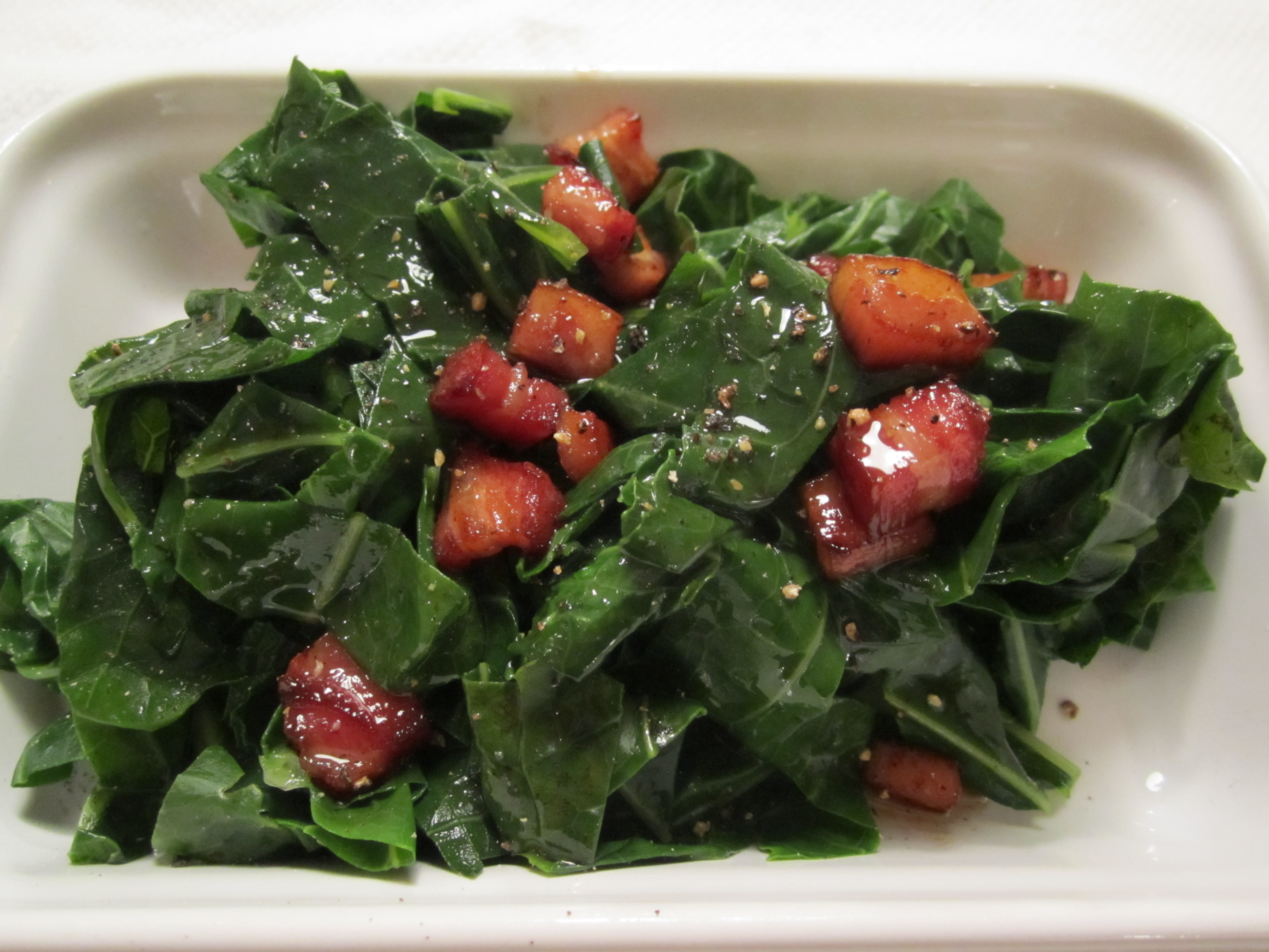 After they’re stripped, I slice them into 1/2″ ribbons and boil for about 5 to 8 minutes, then drain. In a skillet, render some cubes of bacon, then add a splash of red wine vinegar and agave nectar (or honey) right to the skillet with the bacon and drippings, and pour over greens and toss like a salad dressing.