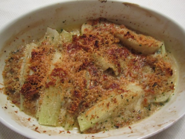 If you look back a couple of posts, you’ll see my recipe for gratinate of broccoli and cauliflower. This dish is similar but there are a couple of key differences. The fennel needs to cook through completely in broth prior to baking with breadcrumbs. It needs to be very soft–not al-dente. Also, I’m using a little butter in this one and a little grated parmiggiano cheese as well as the seasoned breadcrumbs (I’m making my own).