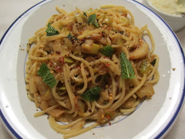 While I’m on the subject of fennel (see yesterday’s post), I wanted to make this pasta dish. It’s spaghetti tossed with caramelized fennel, leeks, garlic, chili flakes and mint. You can make the same dish as a vegetable, omitting the spaghetti, but tonight, it’s my main course and I’m in the mood for pasta.