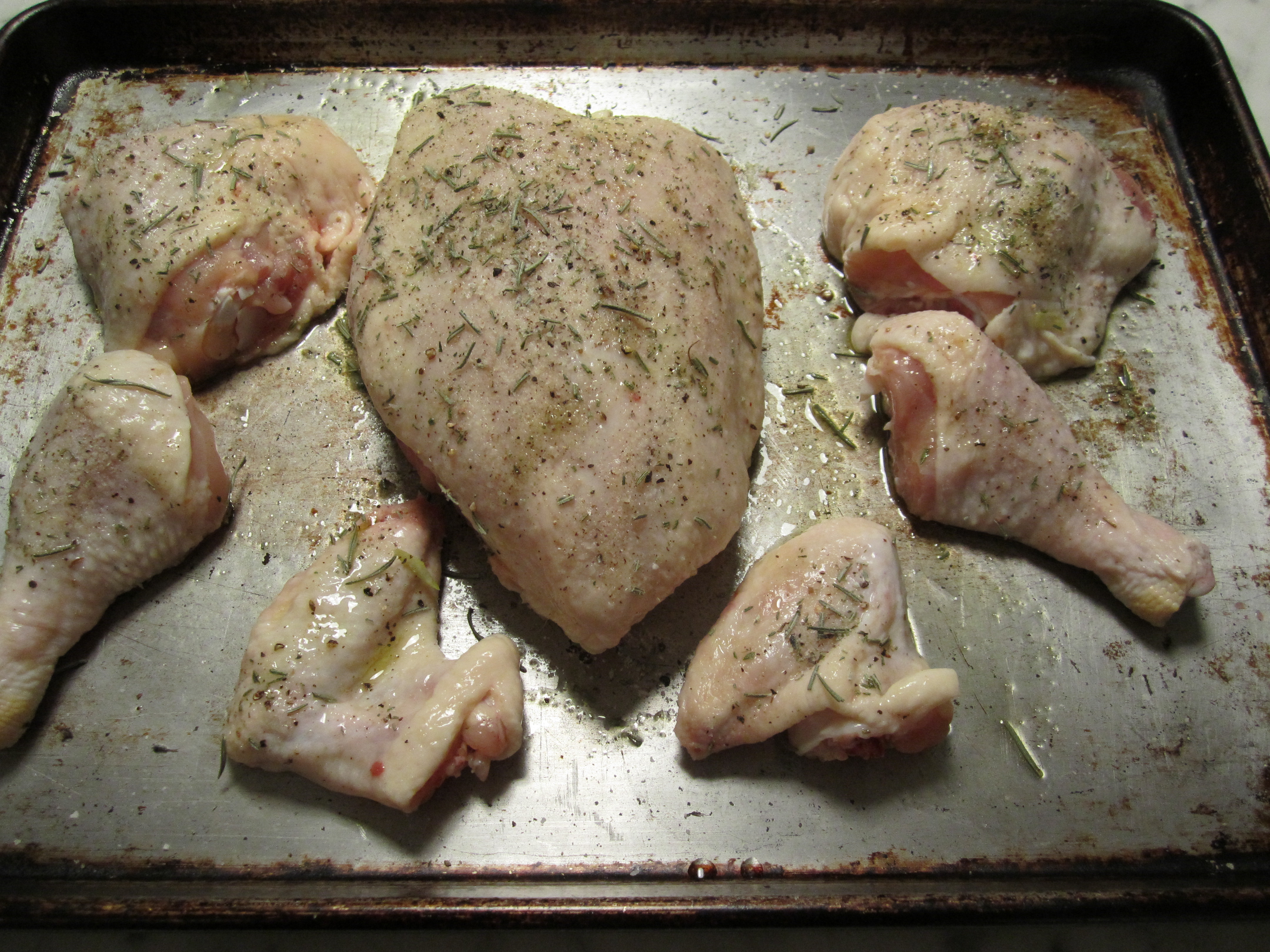 Then proceed with the butchering. The breast remains whole (not split) on the bone. I divide the thighs and drumsticks and place all on a roasting pan with the breast in the middle. Drizzle generously with olive oil and rub on lots of salt, pepper and dried rosemary.