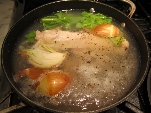 I start out by cutting out the backbone of a whole chicken, then the wing tips. Throw them into a pot, along with the neck, a stalk of celery and an onion cut in quarters and fill with water. Simmer this broth while you’re doing everything else. If you really don’t feel like making broth tonight, just save the backbone and wing tips, put them in a ziploc and toss into the freezer. You can accumulate chicken parts and make broth some other time.