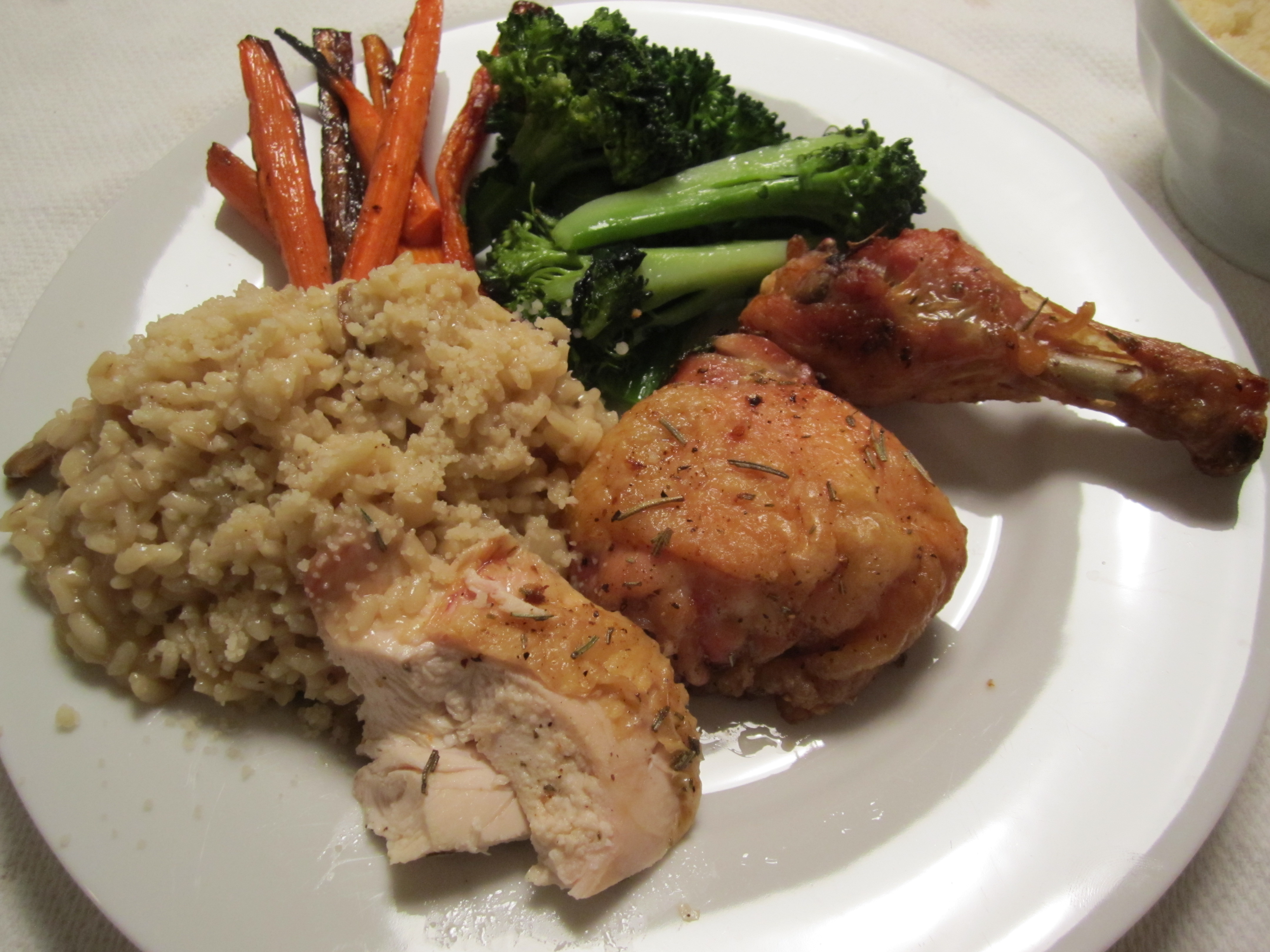 Roast together for 40 minutes, while basting once or twice. Remove breast and take temperature (should be about 165). Let it rest at room temperature.