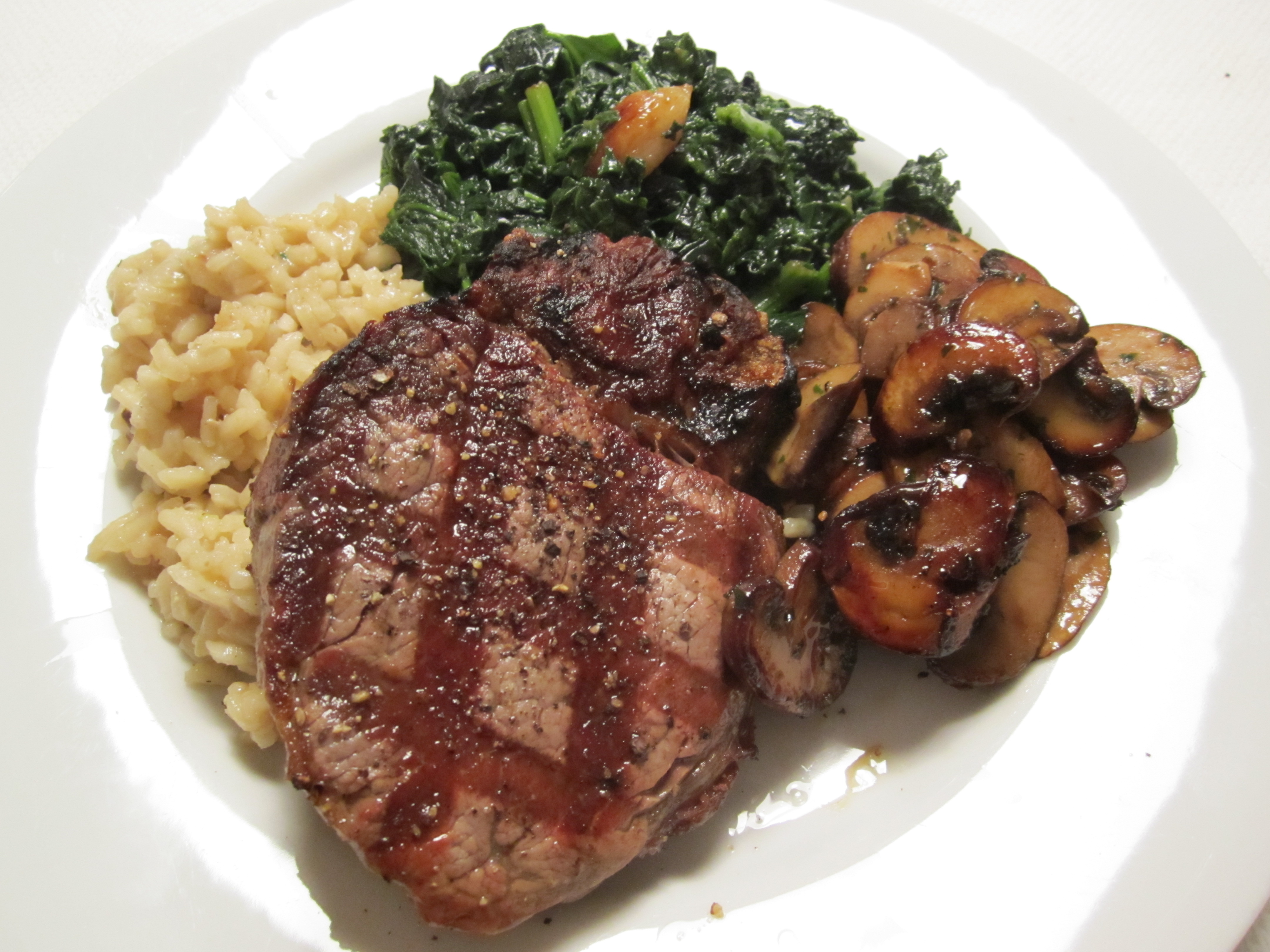 Since I have leftover risotto with porcini from the other night, I’m building tonight’s meal around it–a grilled filet, sauteed cremini mushrooms and sauteed spinach.