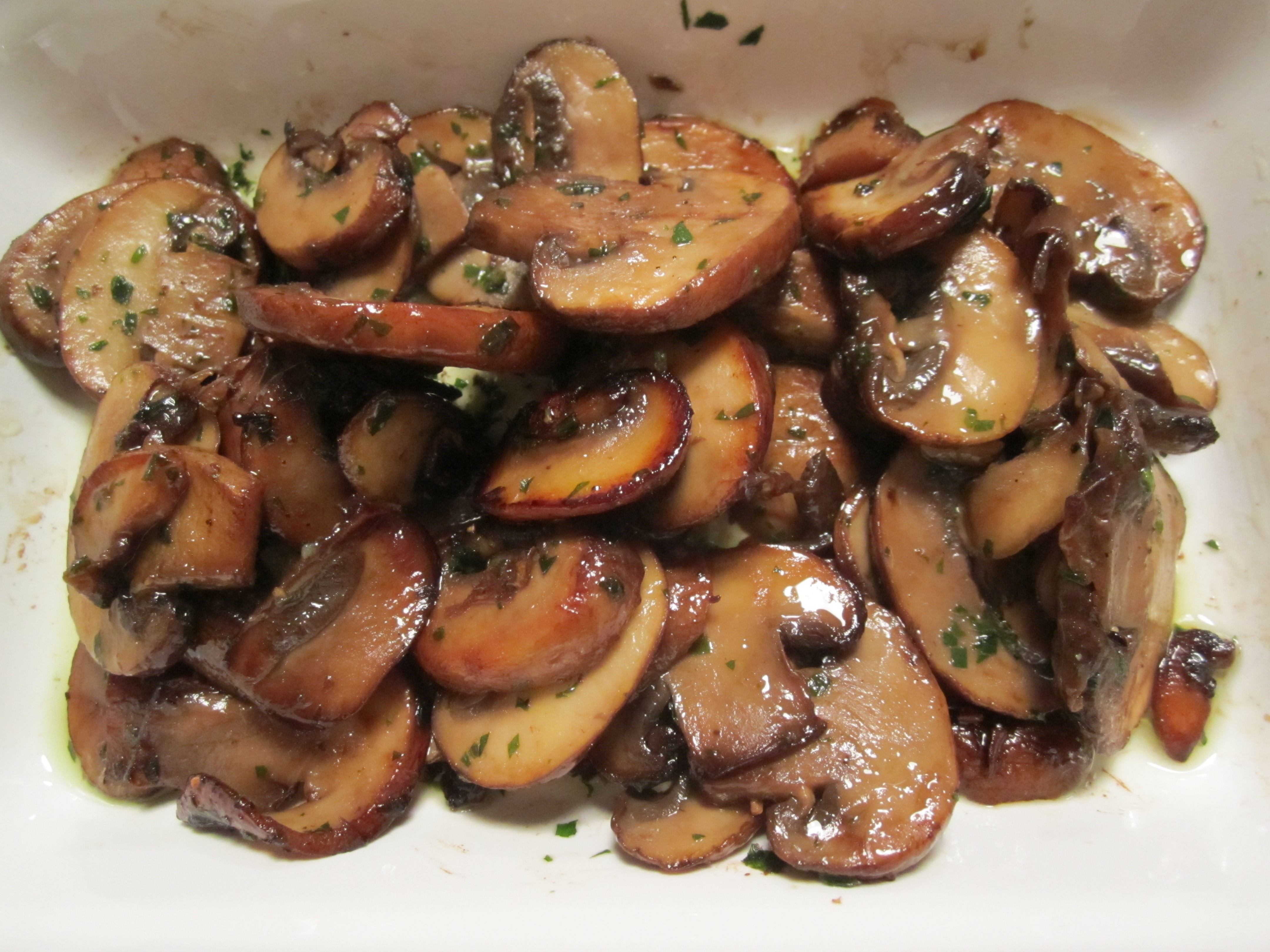 In a broad skillet with flared sides, brown the garlic in oil on low heat until it’s golden on all sides. Turn up heat and add butter and mushrooms and saute until mushrooms begin to become golden (maybe 5 minutes). Add salt and pepper to taste, then add sherry and continue cooking on high heat until sherry has evaporated and mushrooms begin to become glazed with the sherry essence (maybe another 5 to 8 minutes). Toss in chopped parsley and serve.