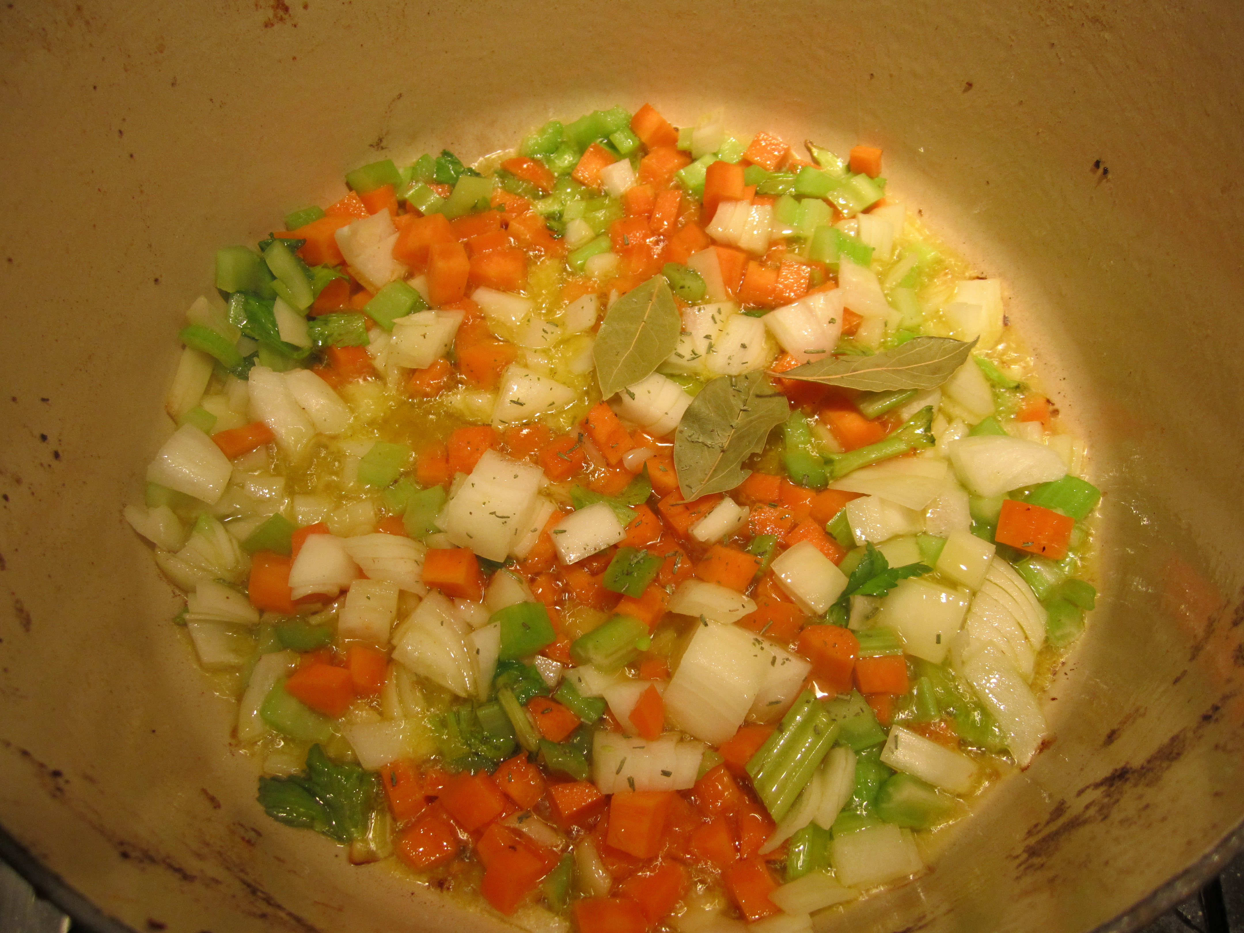 Add new oil to the pot and throw in onion, celery, carrot, bay leaves, rosemary.
