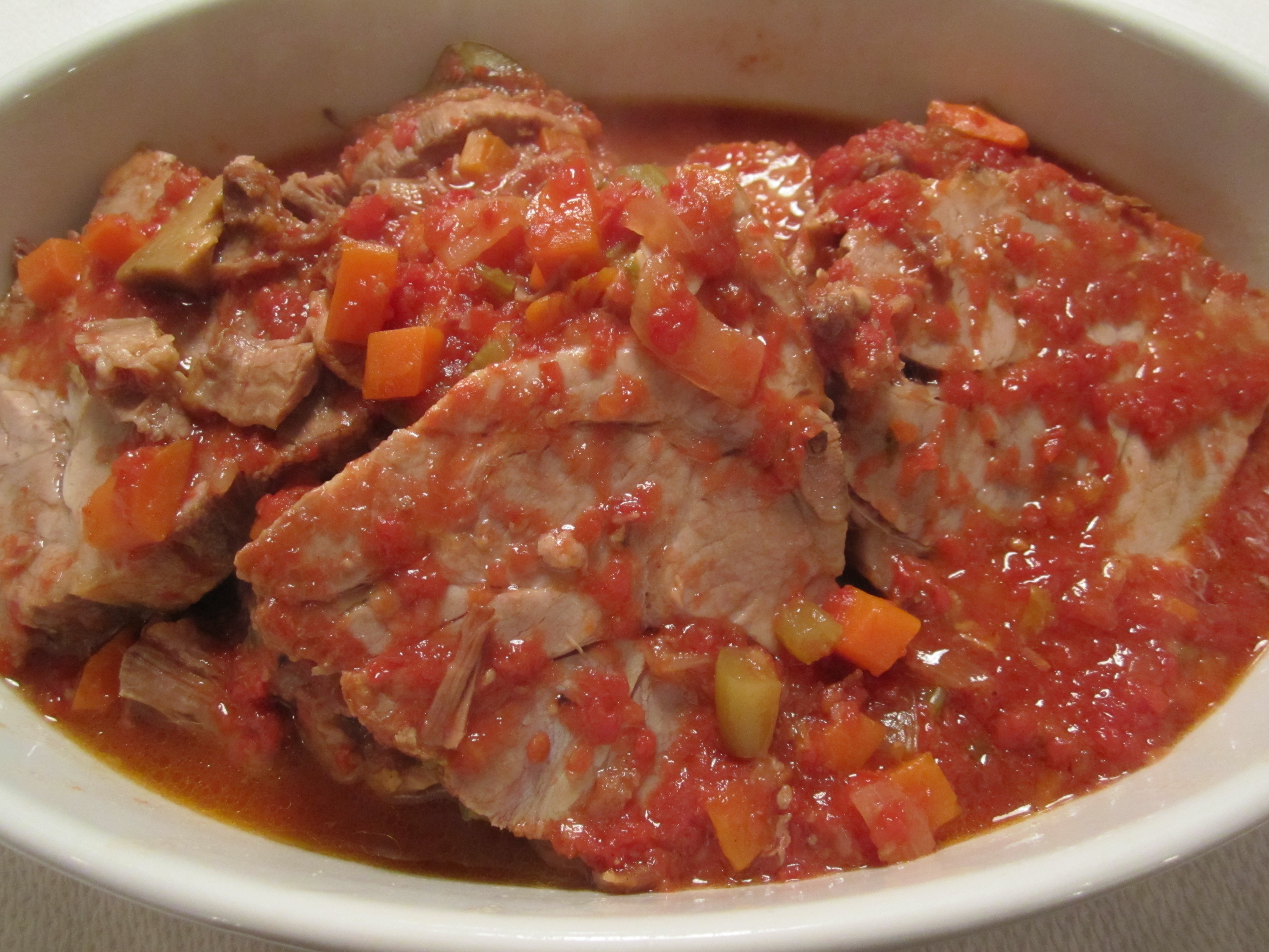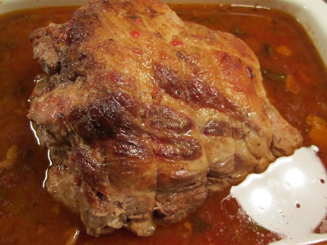 Unlike the relatively austere veal roast I made for my New Year’s Eve post, this is a heartier and more tomato-based preparation. There is rosemary, bay, white wine, and some dried porcini. There is celery, onion and carrot, as well as some homemade chicken broth and a jar of my mother’s home-canned Jersey tomatoes from the fall (a roast like this is worthy of those tomatoes!)