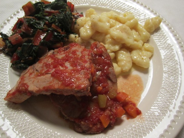 Tonight I’m serving the pork with sauteed swiss chard and homemade gnocchi (tune in tomorrow for that lesson).