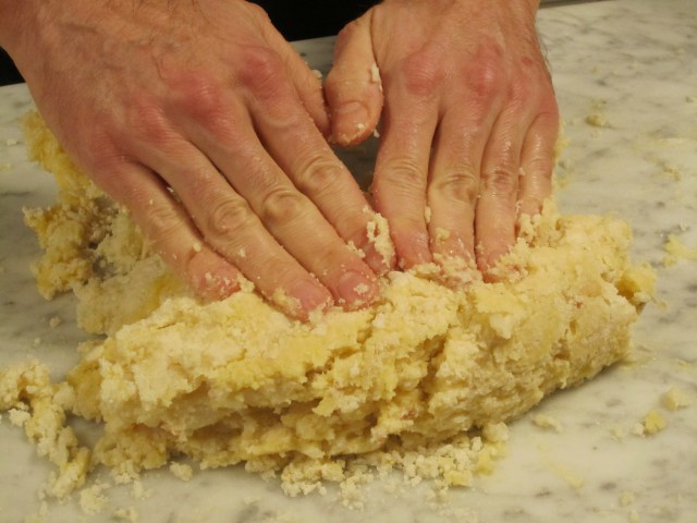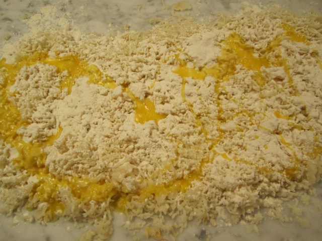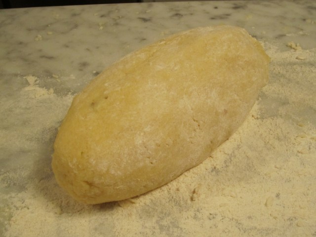 Sprinkle flour over the potatoes a little at a time, while lightly kneeding into a solid mass. Use only enough flour to make the dough hold together.