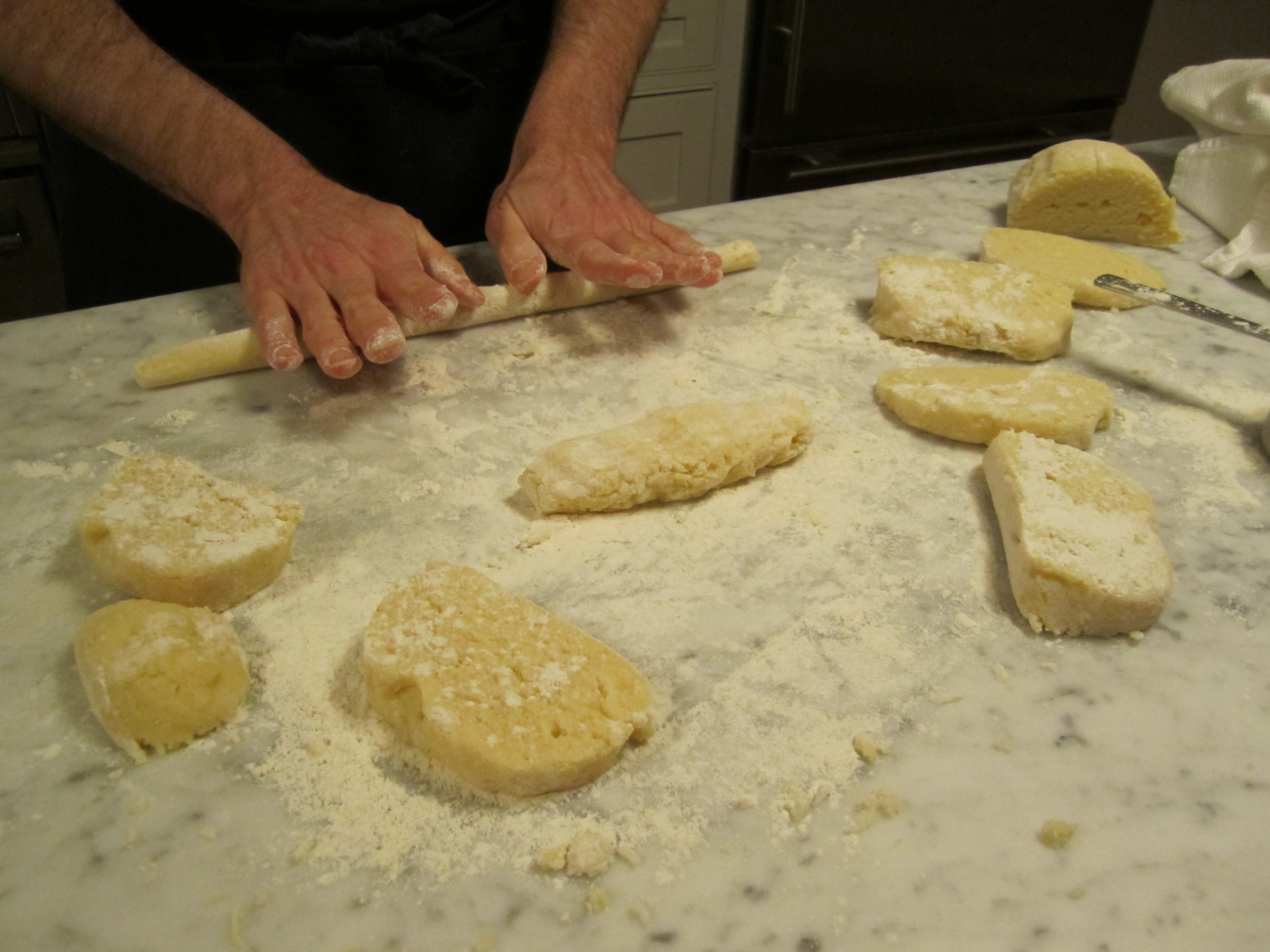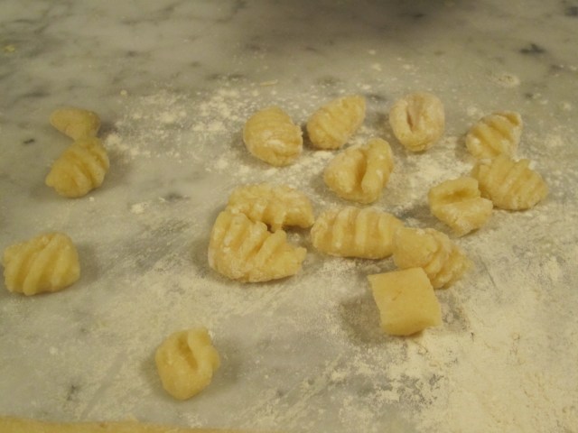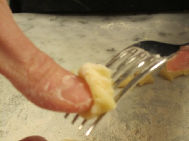The potatoes get baked and scooped out, riced, then spread out on a counter, sprinkled with flour and beaten egg. There is minimal kneeding, then the dough is cut in pieces and formed into little logs. The logs are then sliced into little pillows and the pillows are each run across the back of a fork to make ridges in them. The ridges and the corresponding cleft on the underside of the gnocchi allow the sauce to cling to them and permeate them better.