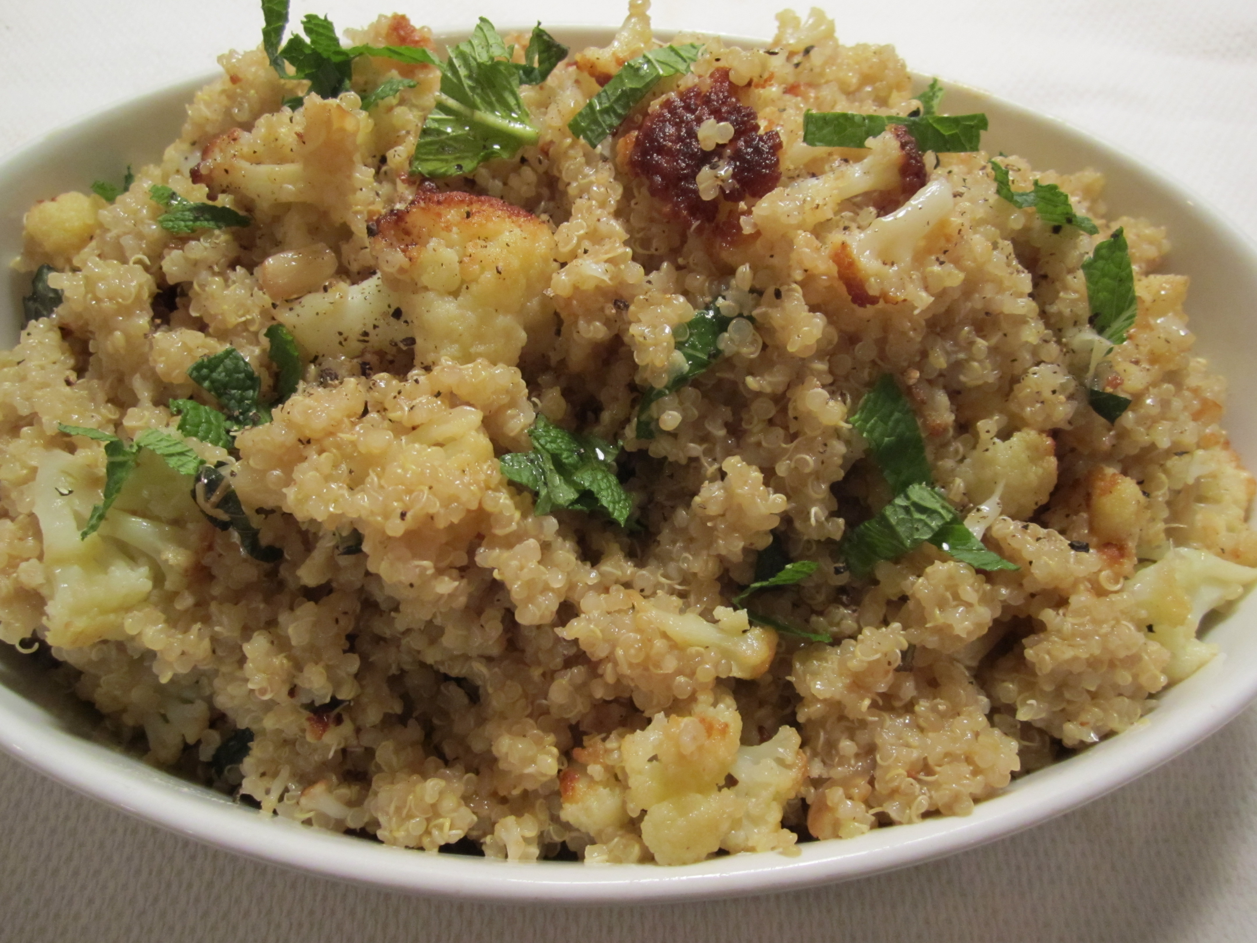 Combine cauliflower mixture with quinoa and add mint. Drizzle on the remaining olive oil and serve.