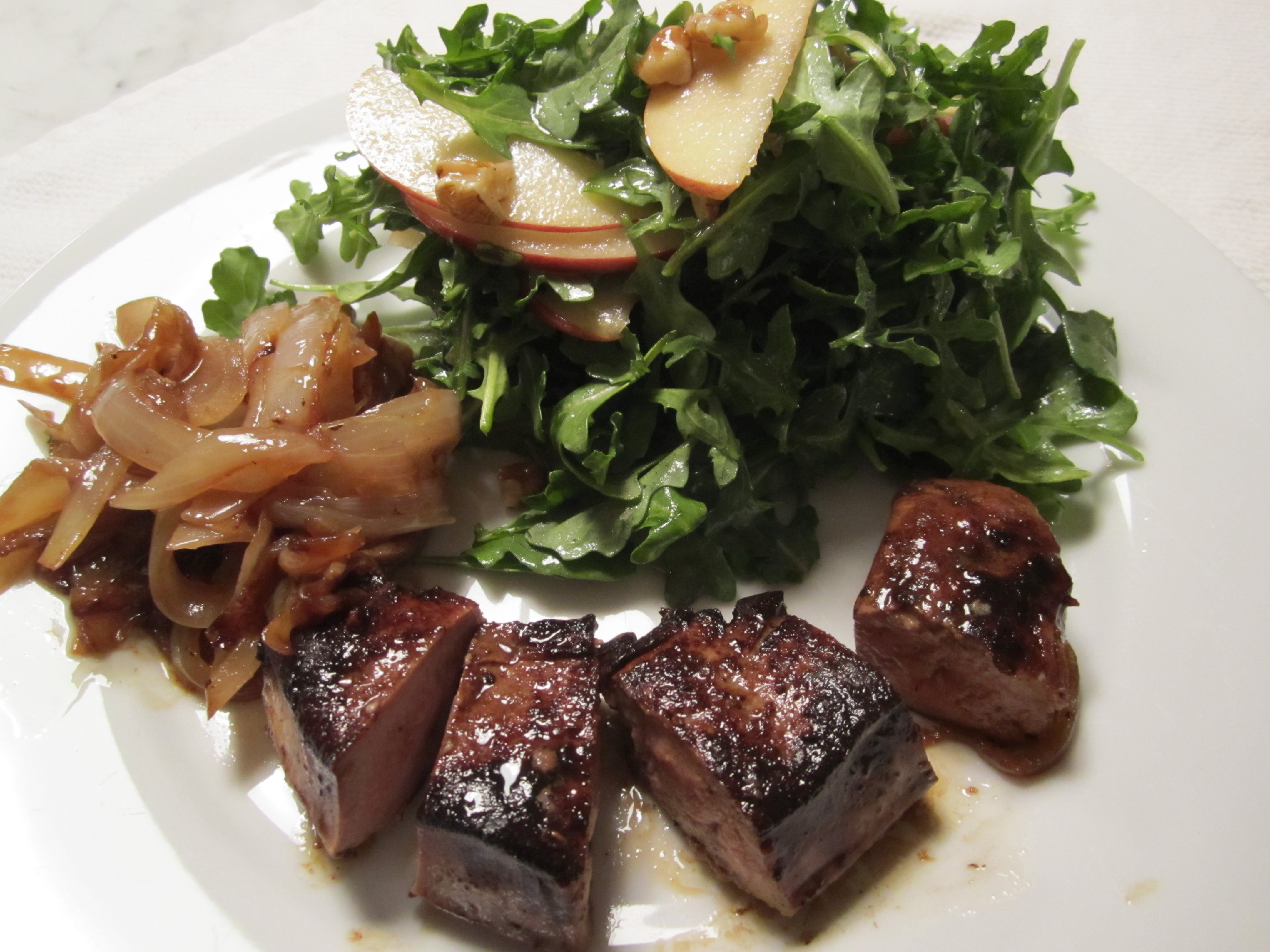 Instead of serving rice or polenta, I like to serve my liver with a salad, incorporating a sweet/tart dressing. The salad is a combination of baby arugula, sliced apples and walnuts. It’s dressed with red wine vinegar, agave, and extra-virgin olive oil. This is truly a bright, exciting and light way to serve liver–it’s reminiscent of the way the french sometimes serve foie gras as an appetizer with salad. If you like foie gras, you will love this dish (it’s a bit lighter as well)!