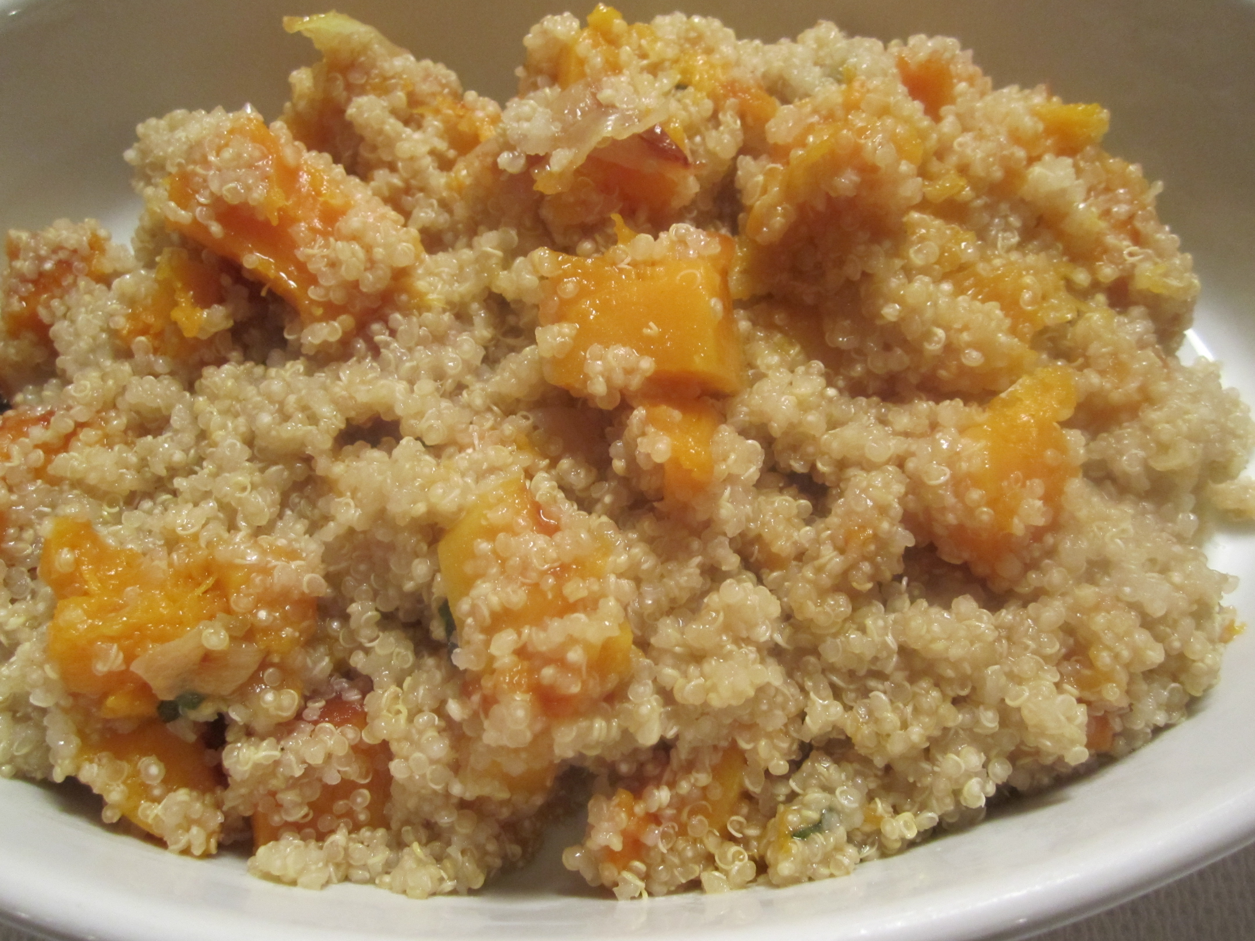 This dish is essentially exactly the same as my prior post (“butternut squash with farro”), only substituting quinoa for farro. You’ll see me using quinoa quite a bit in the coming months, not just because it’s so good for you and delicious, but because I enthusiastically bought a 4-lb. bag of it at Costco.