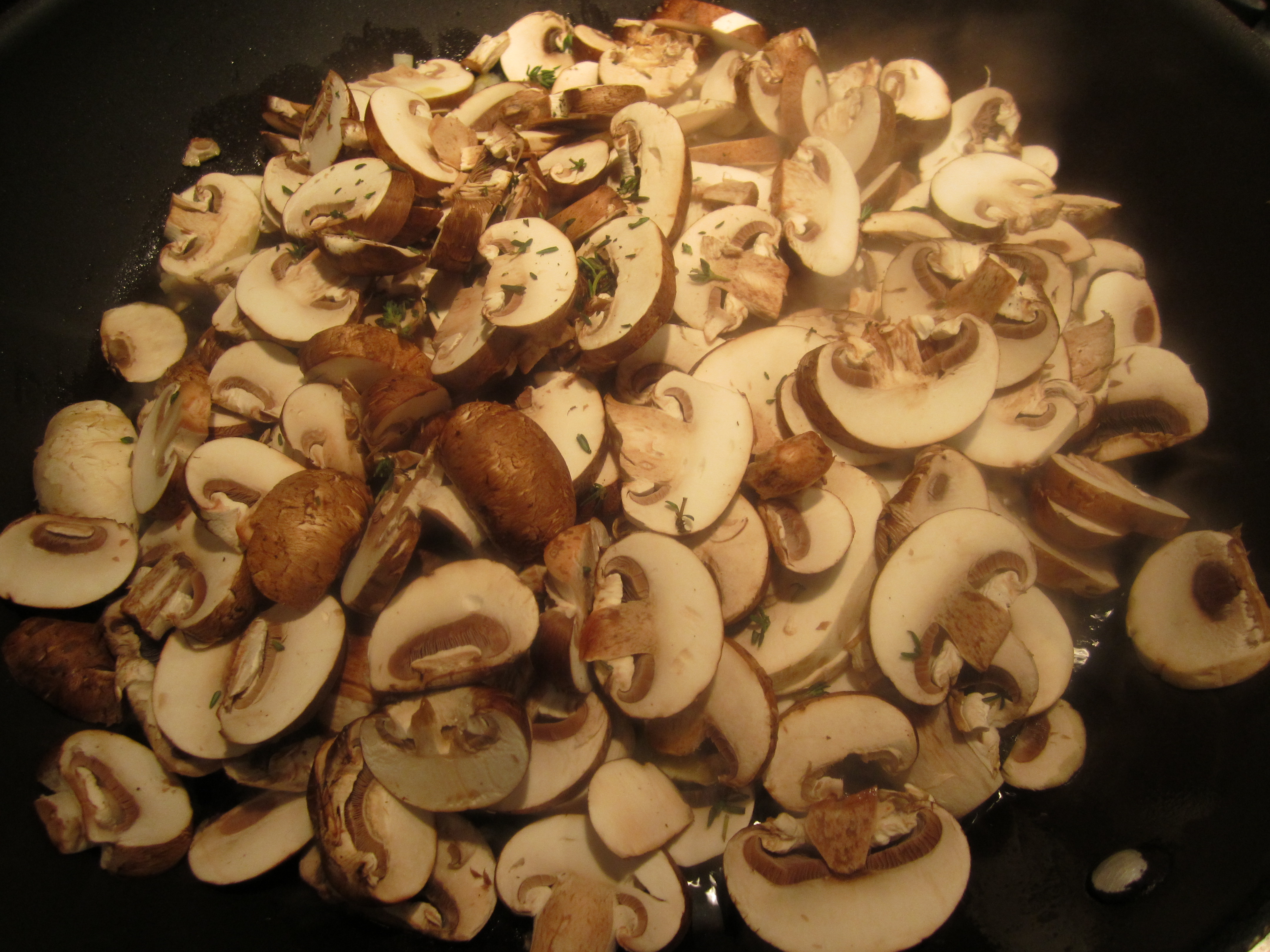 In a broad skillet on high heat, saute the mushrooms, thyme and onion in oil until the mushrooms begin to turn golden.