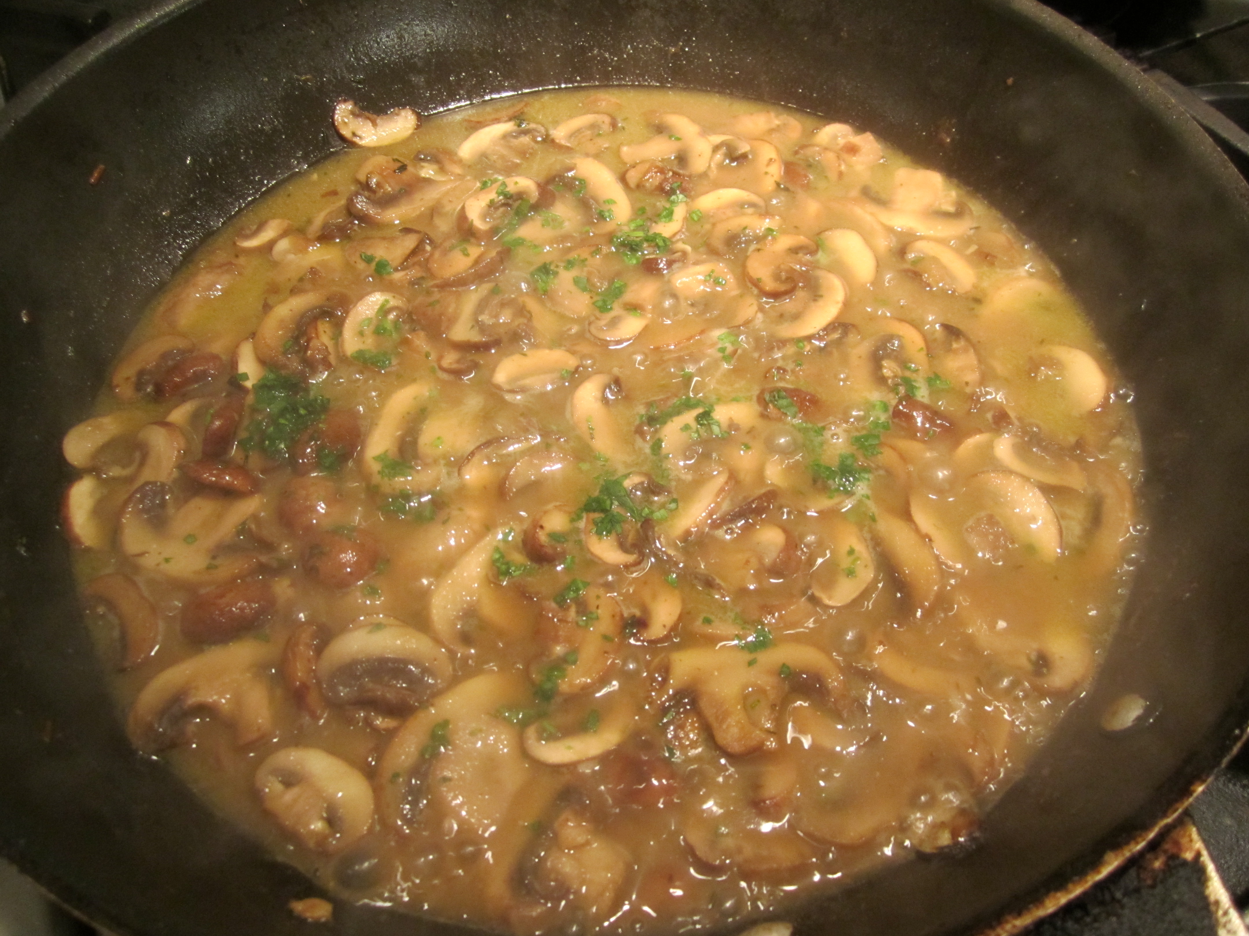 Pour in the wine and reduce until the wine has evaporated. Add salt and pepper and taste. Add in chicken broth and bring to a boil. Sprinkle with parsley.