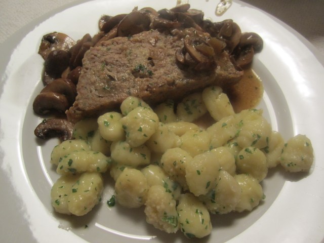 It’s also great with pasta, which is the other half of my meal this evening. You may recall I made gnocchi a couple of weeks ago . . . I have a nice bag of it left in the freezer (uncooked). I’ll dress the gnocchi with a little butter and parsley, some of the mushroom sauce will find its way under and around the gnocchi and they’ll taste great together . . . not bad for Monday night leftovers.