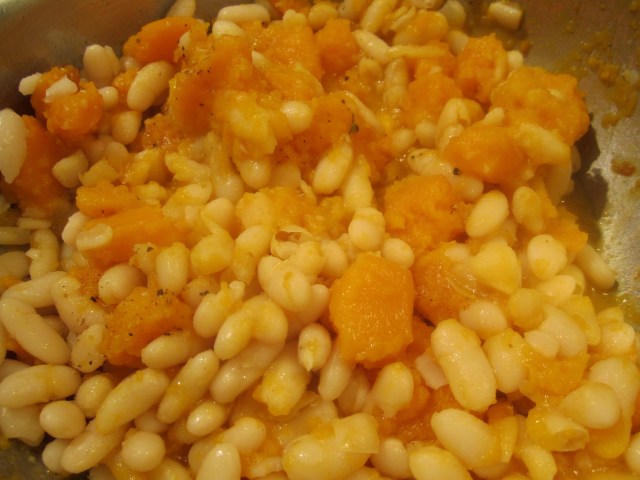 The butternut squash is cut into small cubes and sauteed in oil for about 10 minutes, covered, then simply tossed with the cooked, drained beans, and dressed with raw oil, salt and pepper. Save a bit of the bean cooking liquid to add to the dish to make it creamy.