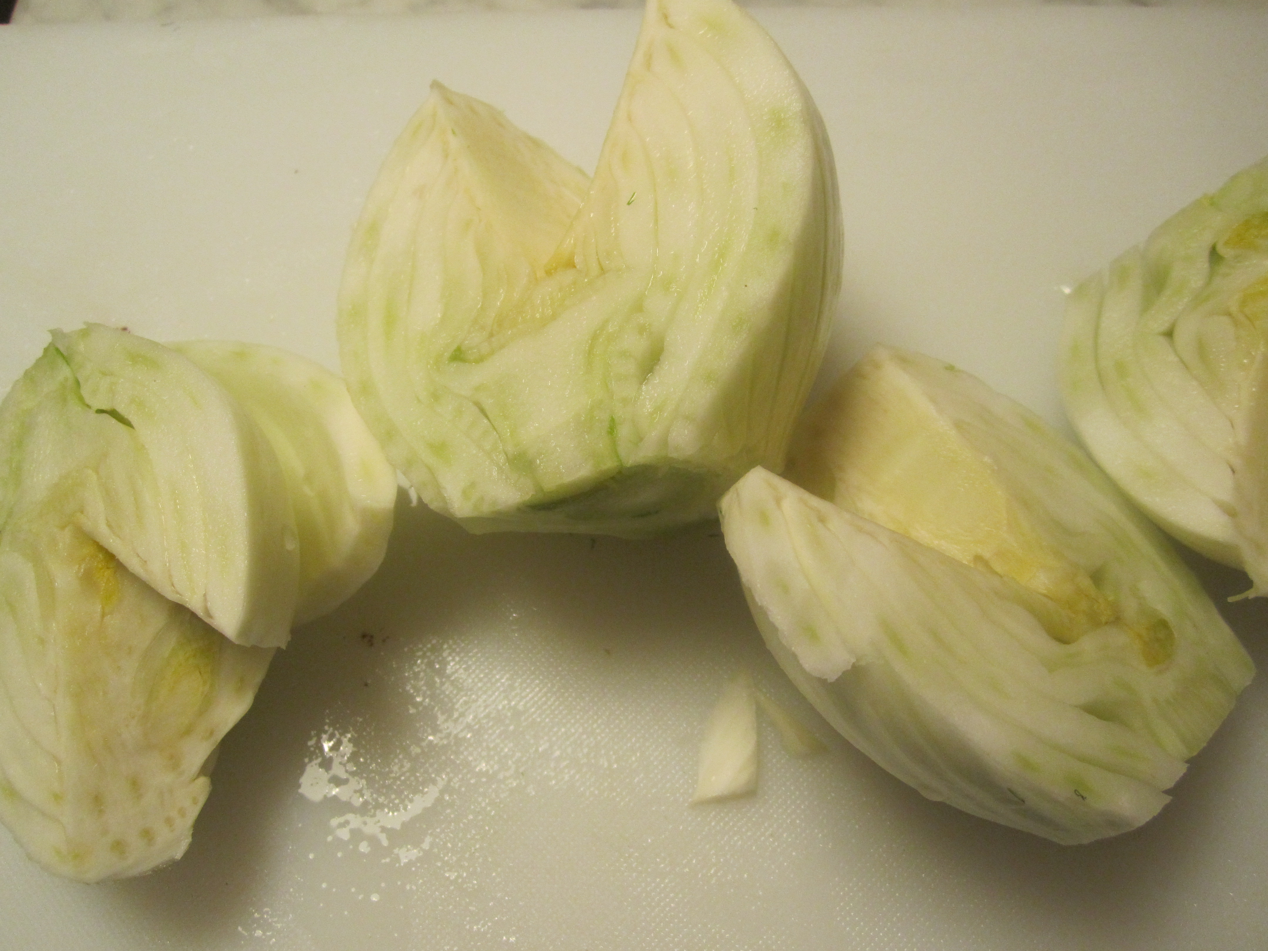 The fennel is first trimmed of its stalks, then of its tough outer layers (sometimes they are quite thick and it seems you’re discarding half the bulb, but they must be discarded because they’re too fibrous and chewy). Then cut the core out of the bulb, resulting in a triangle-shaped hole in the base of the bulbs.