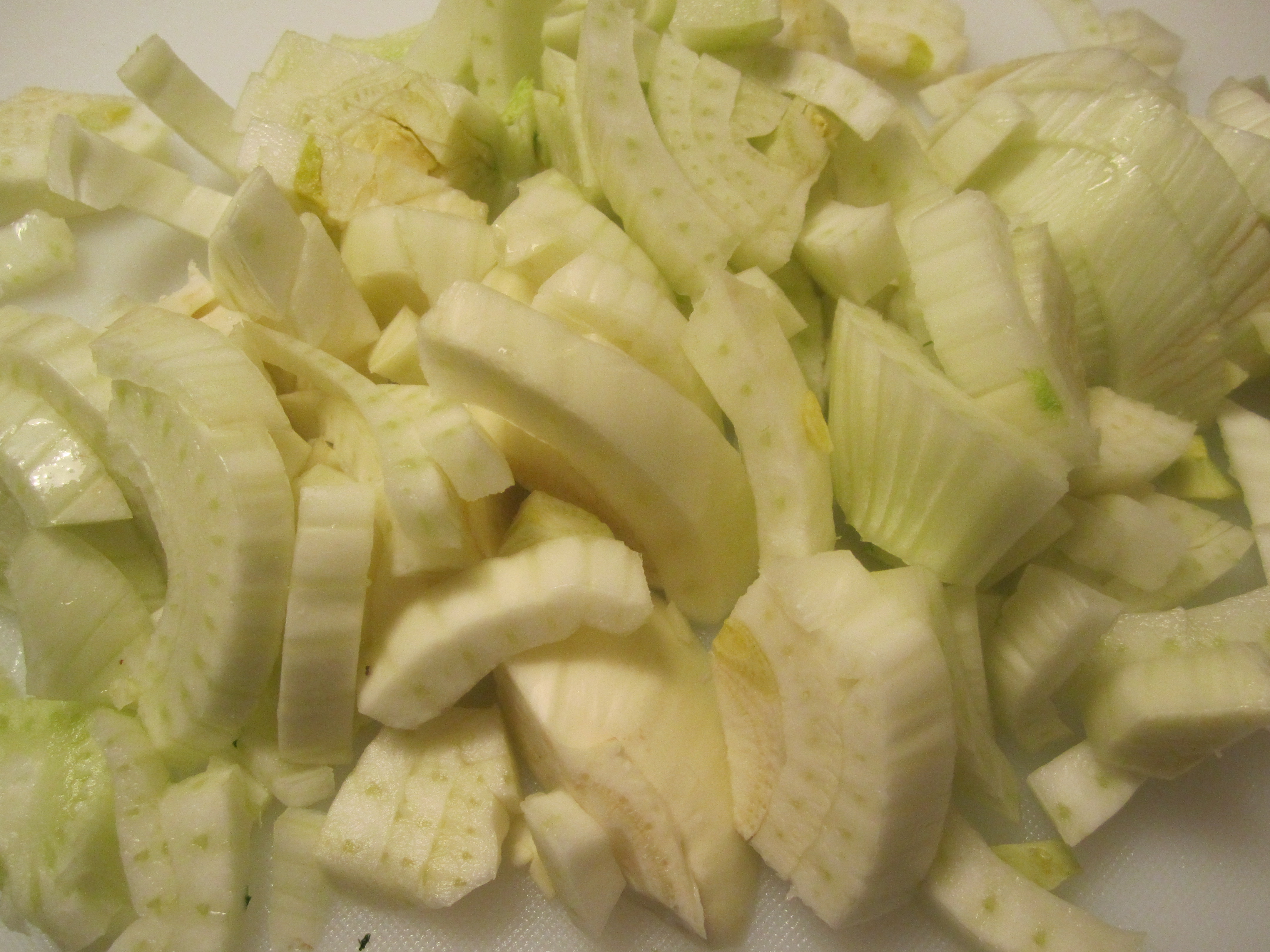 Since I’ve already discussed my method of cooking sausage in a prior post (my first “dinner for one” post), the real feature of tonight’s post is the potato and fennel . . .