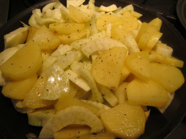 The potatoes are peeled and sliced into similar half-moon slices (slightly thinner than 1/2″ slices), and all is placed in a nonstick skillet with a couple of tablespoons of olive oil, a good sprinkle of salt, and a couple of peeled halved garlic cloves. Use one potato per person and half a bulb of fennel per person.