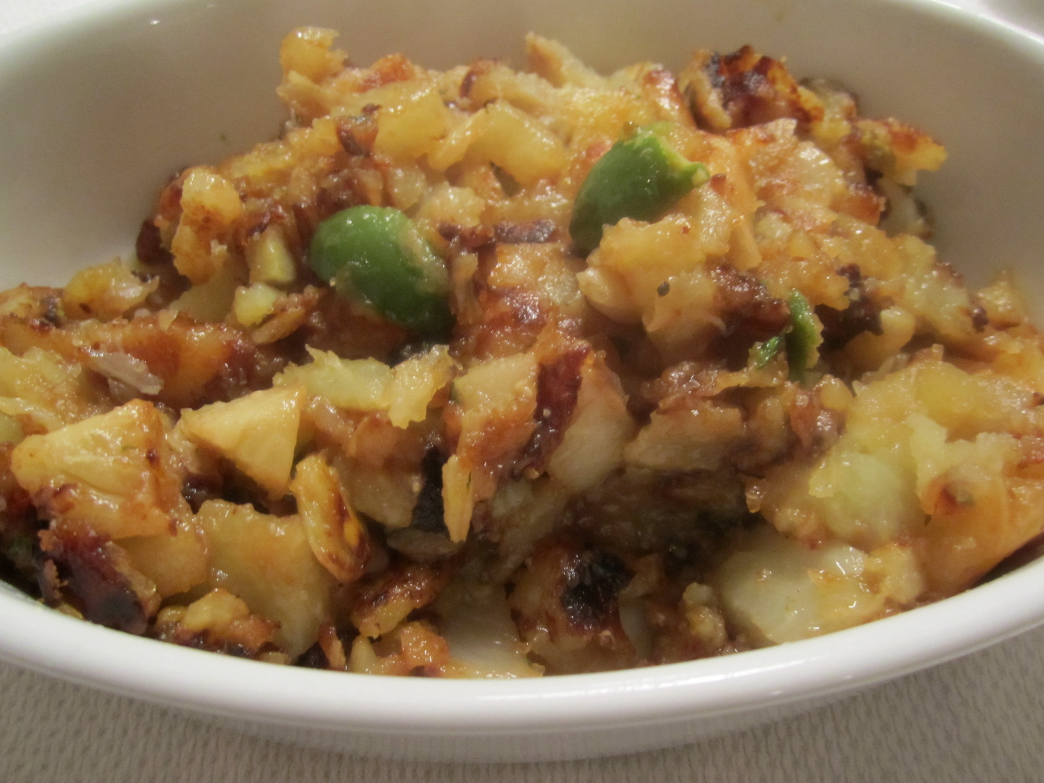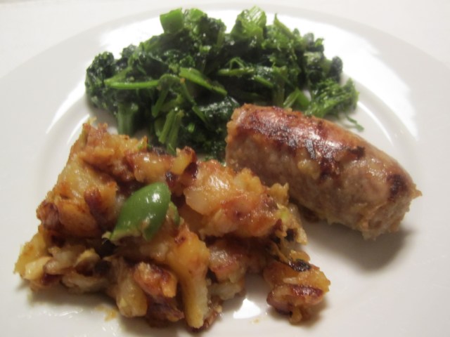 Since I’ve gotten back from Florida it seems that winter is still upon us, so I was in the mood for some meat and potatoes (Italian-style, of course). The meat is simply my favorite juicy Italian pork sausage (from Citarella); the potatoes are my version of a steakhouse hash-brown with fennel and green olives.