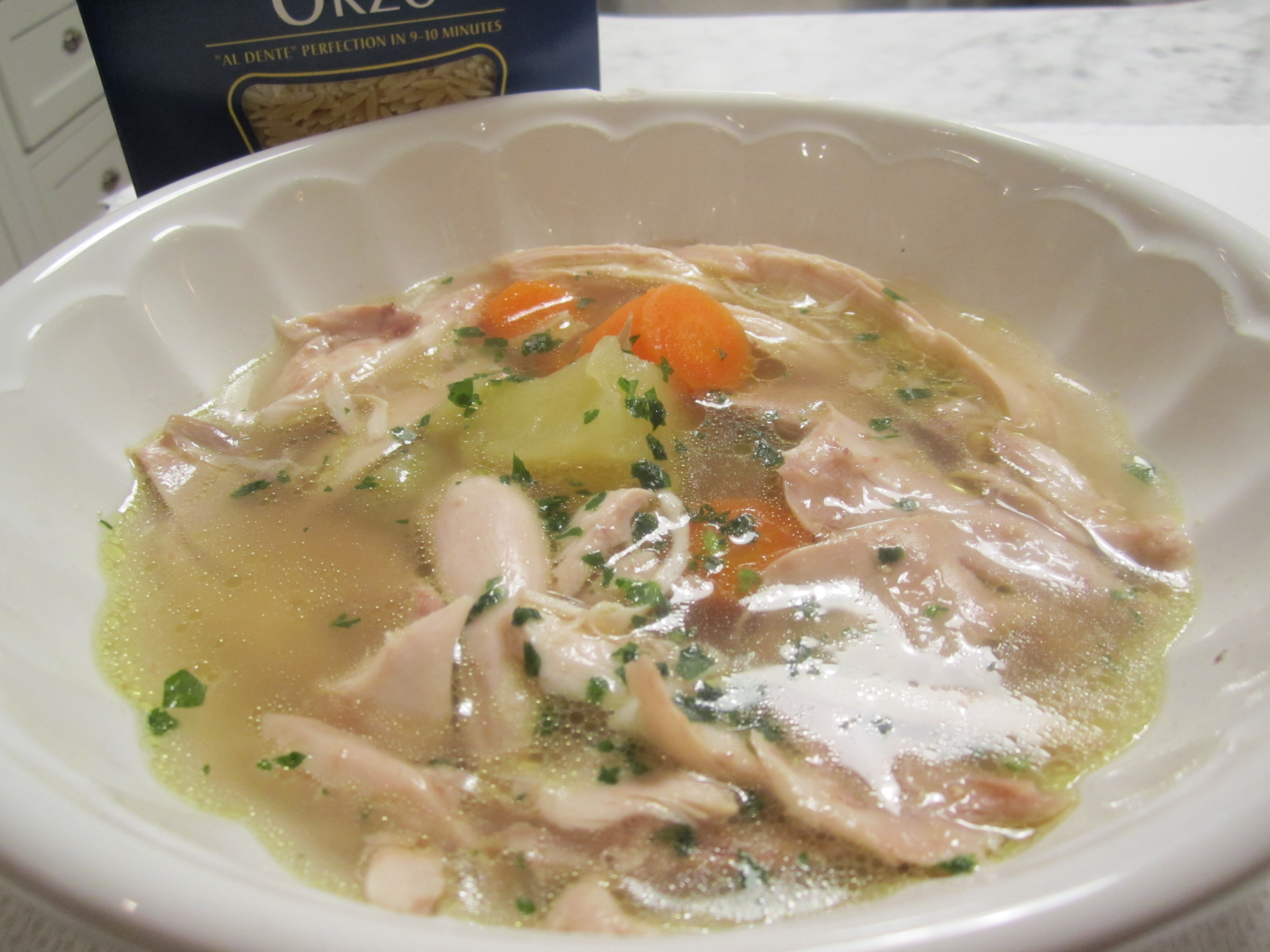 I’m going to make the broth with celery, carrots, onions, some parsley stems and a bay leaf. (For the full recipe, see my prior post “Mom’s Chicken Soup”). After the vegetables have released their flavors, I’ll discard them and boil a new potato and some new carrots and leave them in the broth. I’ll take the chicken meat off the carcass after it cools a bit and add it to the broth, and leave the whole thing in the fridge overnight. Tomorrow, I’ll present the broth with the box of orzo on the side.