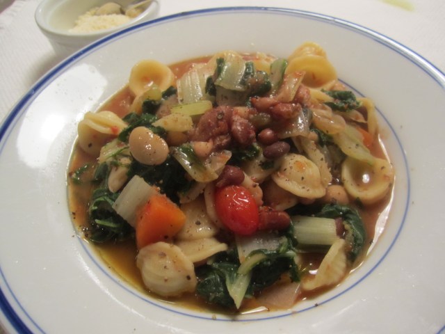 For my own dinner tonight, I’m going to have the last of the leftover bean soup from my “Mixed Bean Soup” post the other evening, with a couple of additions . . . I’ve added some tomato puree to the beans and simmered the soup for about fifteen minutes, then added some cooked swiss chard and cooked orrechiette. That touch of tomato really perks up the deep flavor of the beans and makes it taste like an entirely different and new dish. The dense bean mixture ends up acting more like a sauce for the pasta and swiss chard, rather than a bowl of soup–it’s a great transformation!