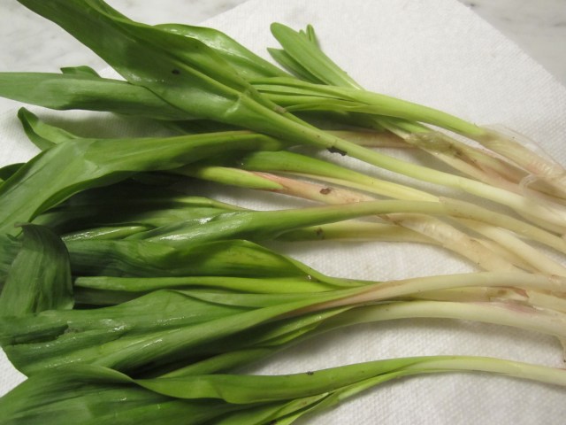 The ramps should be rinsed and separated into two pieces–the lower stem, including the bulb and white part, and the long green leaves.
