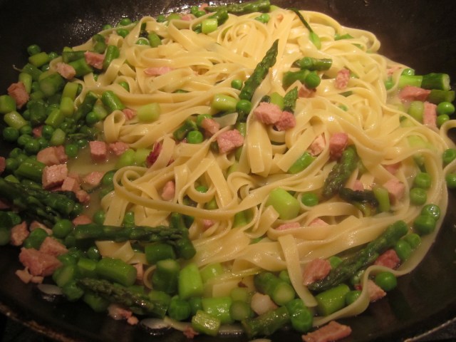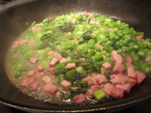Tonight, I’m making the dish heartier with the addition of ham. Ham has that wonderful salty, slighlty smokey flavor, but it’s not as overpowering as bacon or pancetta. Asparagus gives the dish an additional earthy note of springtime (although they’re not local asparagus yet), and peas are always good wherever ham goes.
