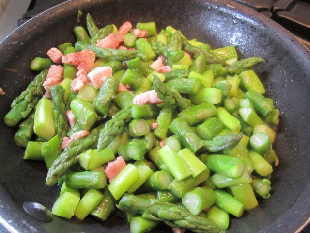I had leftover ham from the pasta dish as well, so I began by sauteing the cubes of ham in a bit of olive oil. Then I added the pre-peeled and cooked asparagus pieces to the skillet and sauteed for a few minutes while I prepared the eggs.