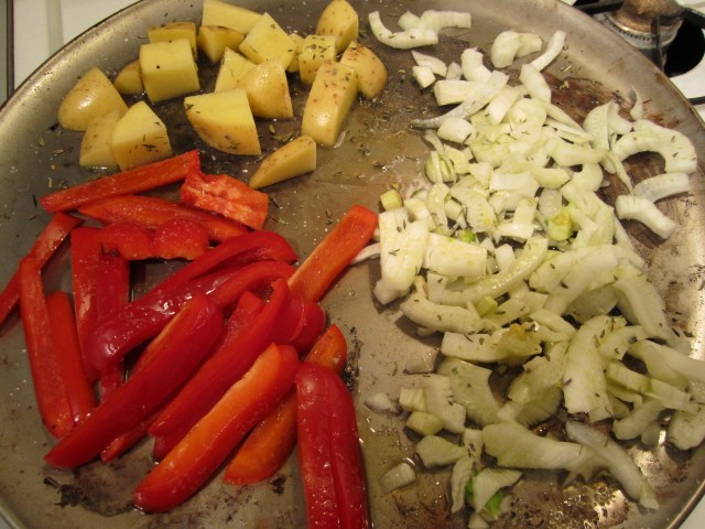 Slice red peppers in half then lengwise into 1/2″ strips. Remove core from fennel and slice crosswise into 1/2″ half-moons. Dice potatoes into 1″ cubes. Lay all out on tray and drizzle with oil, salt pepper and herbs de provence.