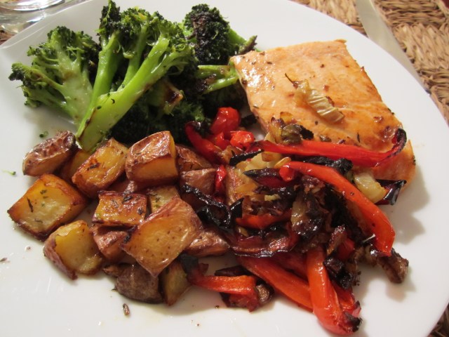 That leaves roasting or poaching. Tonight’s dinner was made on my one pizza tray (with the exception of the broccoli–which you could omit and substitute a salad for). With the exception of the salmon, the ingredients were all cut into bite-size pieces and roasted in a 400 degree oven for about a half hour. Then I added the piece of salmon (skin side up) and continued roasting everything for another twenty minutes. Everything should be ready at about the same time, but if the potatoes are not yet ready, just remove the other components from the roasting tray and continue roasting the potatoes for another 5 or 10 minutes.