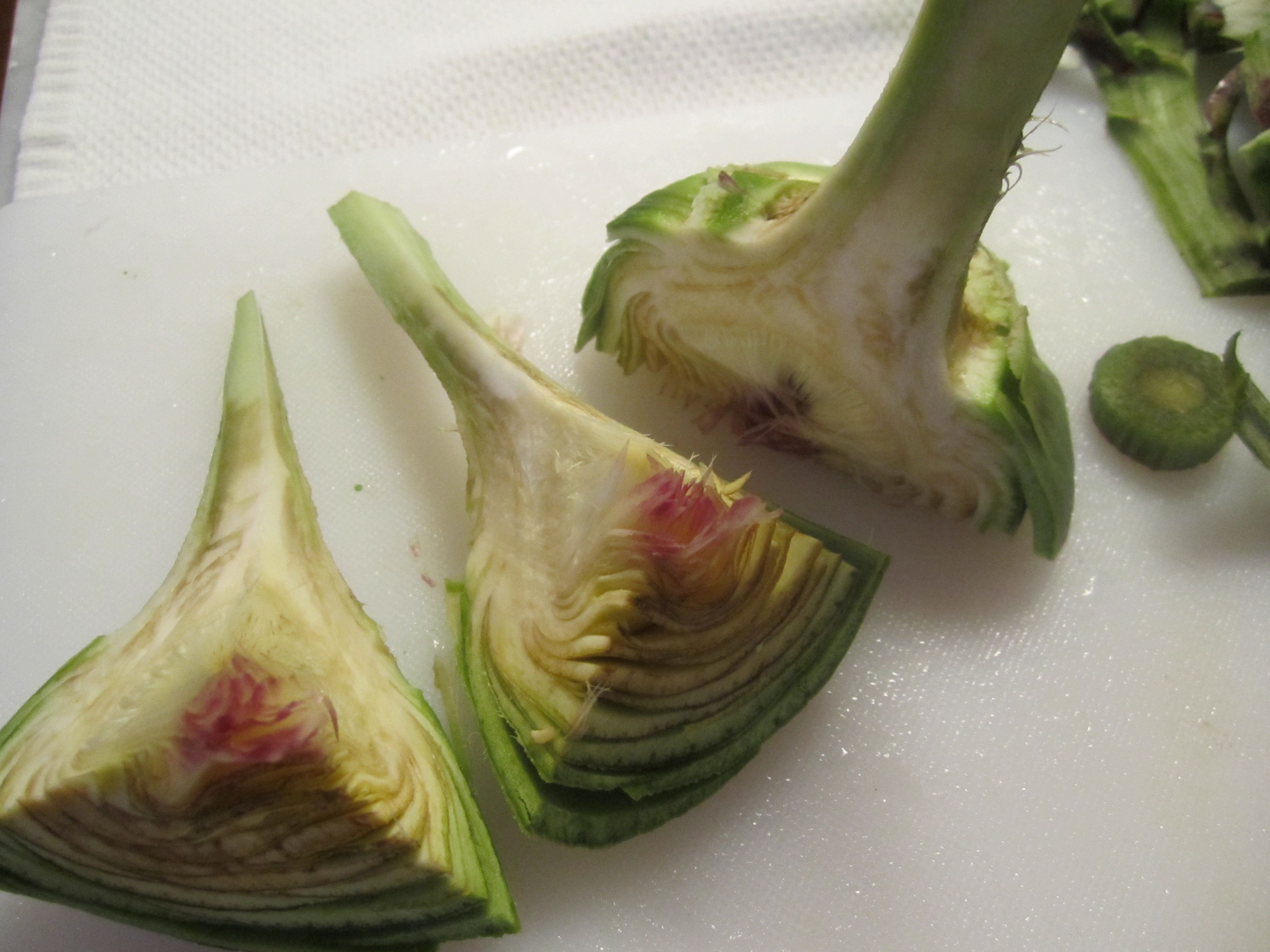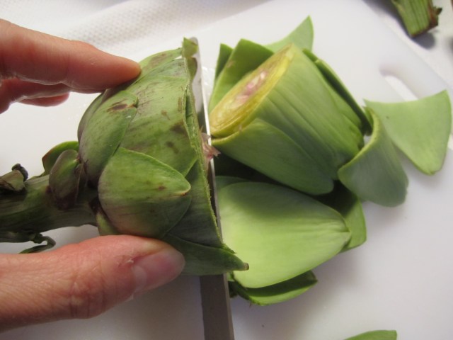 Then with the chef’s knife, cut what remains of the artichoke into quarters, keeping a little stem intact on each quarter.
