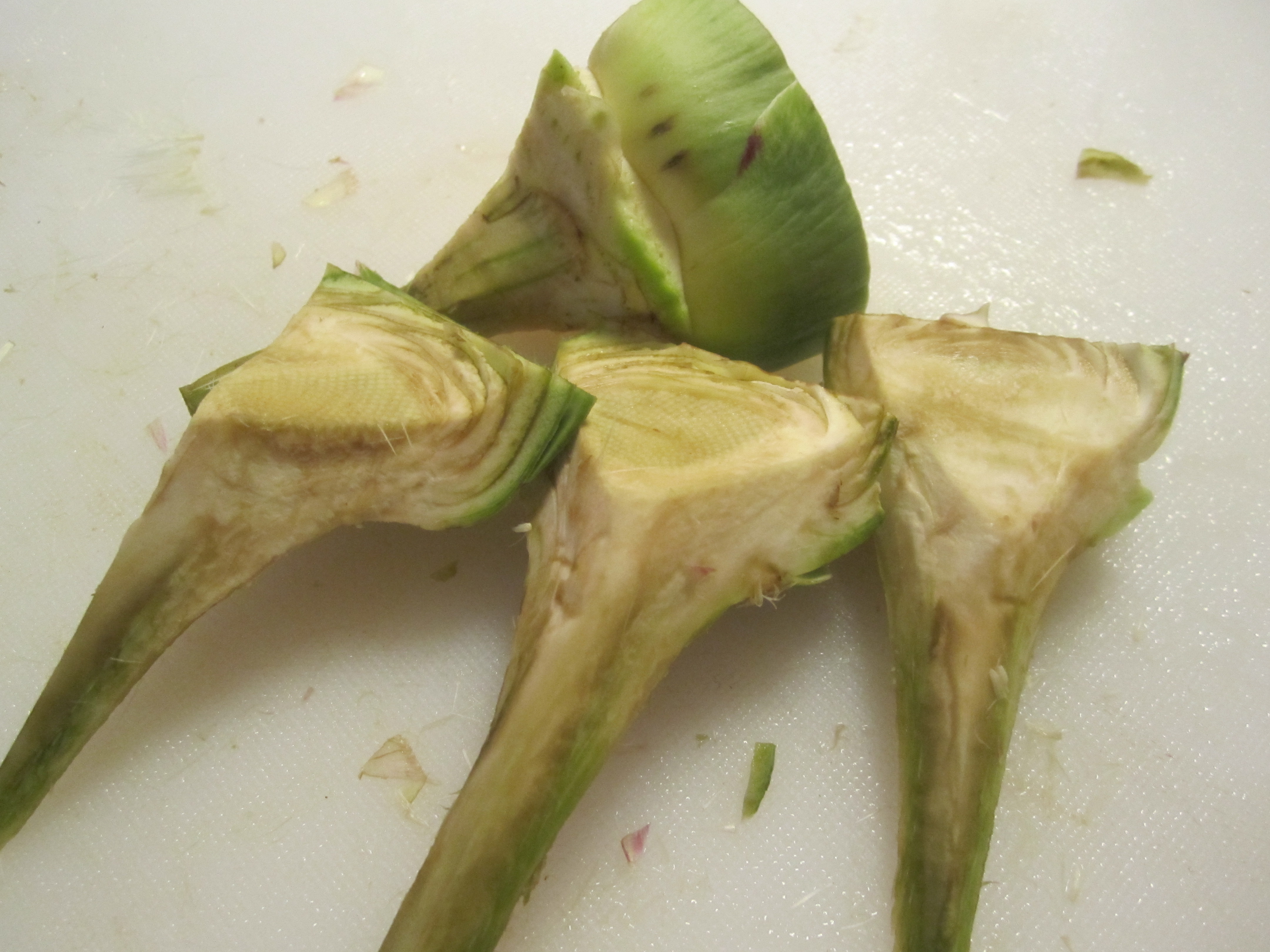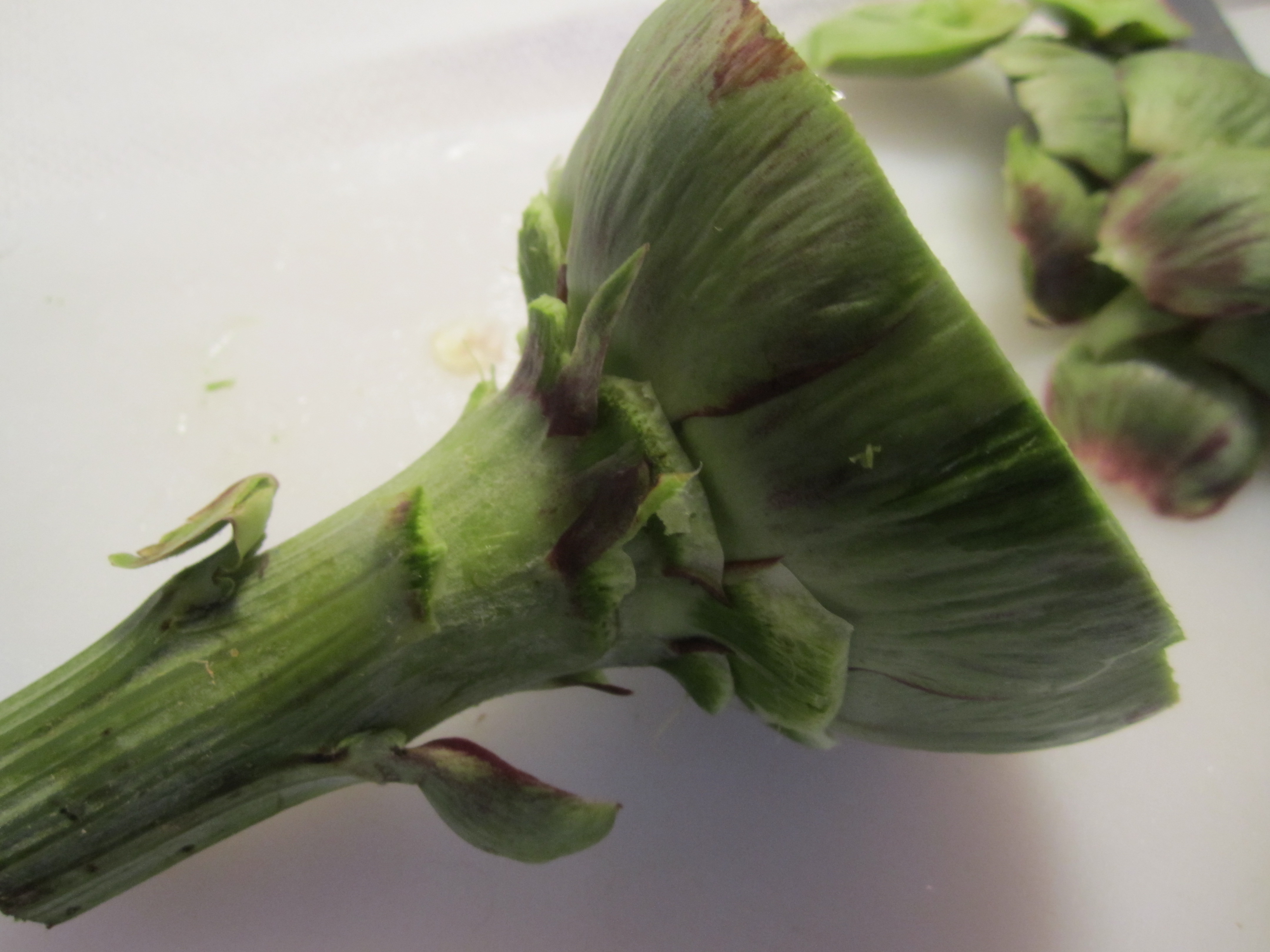 “Trimming” is a vast understatement when it comes to artichokes. Artichokes must be trimmed mercilessly(Marcella Hazan’s terminology), and in fact, are about eighty percent waste. What remains is a delicate, tart, lemony bottom with some stem attached (if you’re lucky enough to find stems still attached to your artichokes). It’s a flavor that really cannot be duplicated by any other vegetable.