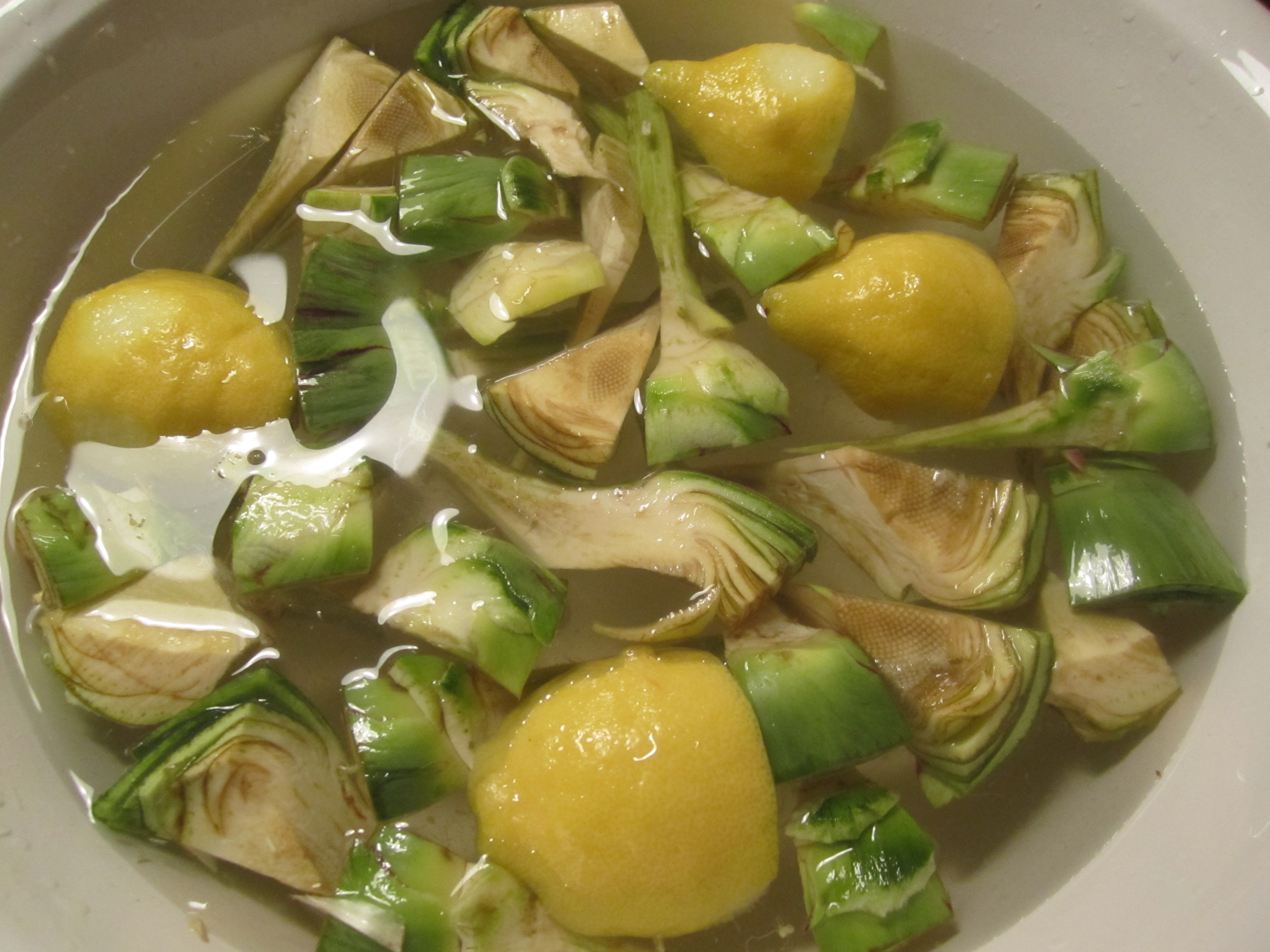 The pieces will blacken as soon as air hits them, so the lemon water keeps them green. In fact, if there is any portion of the trimmed artichoke sticking out of water, it will blacken instantly.