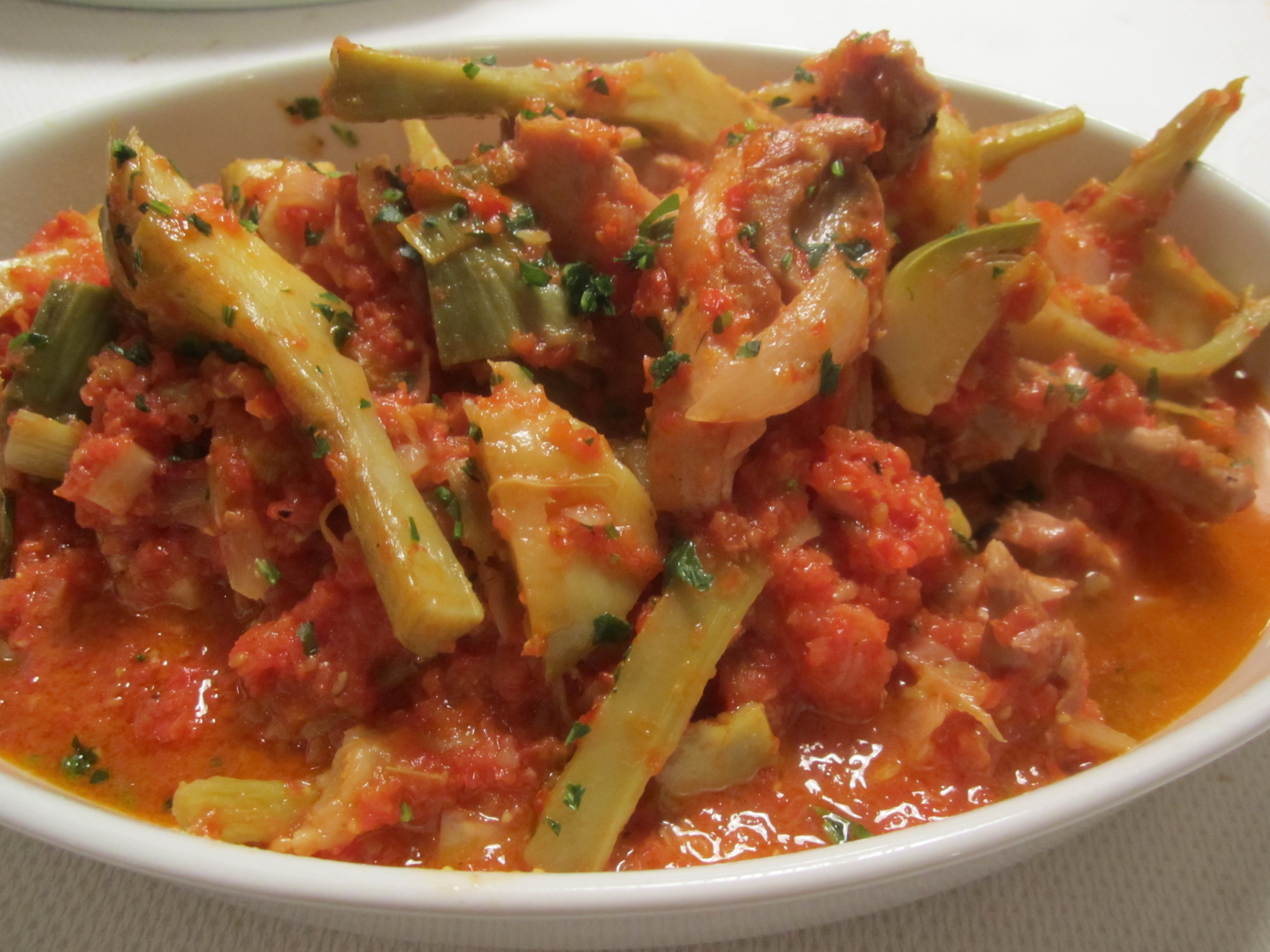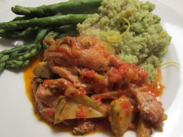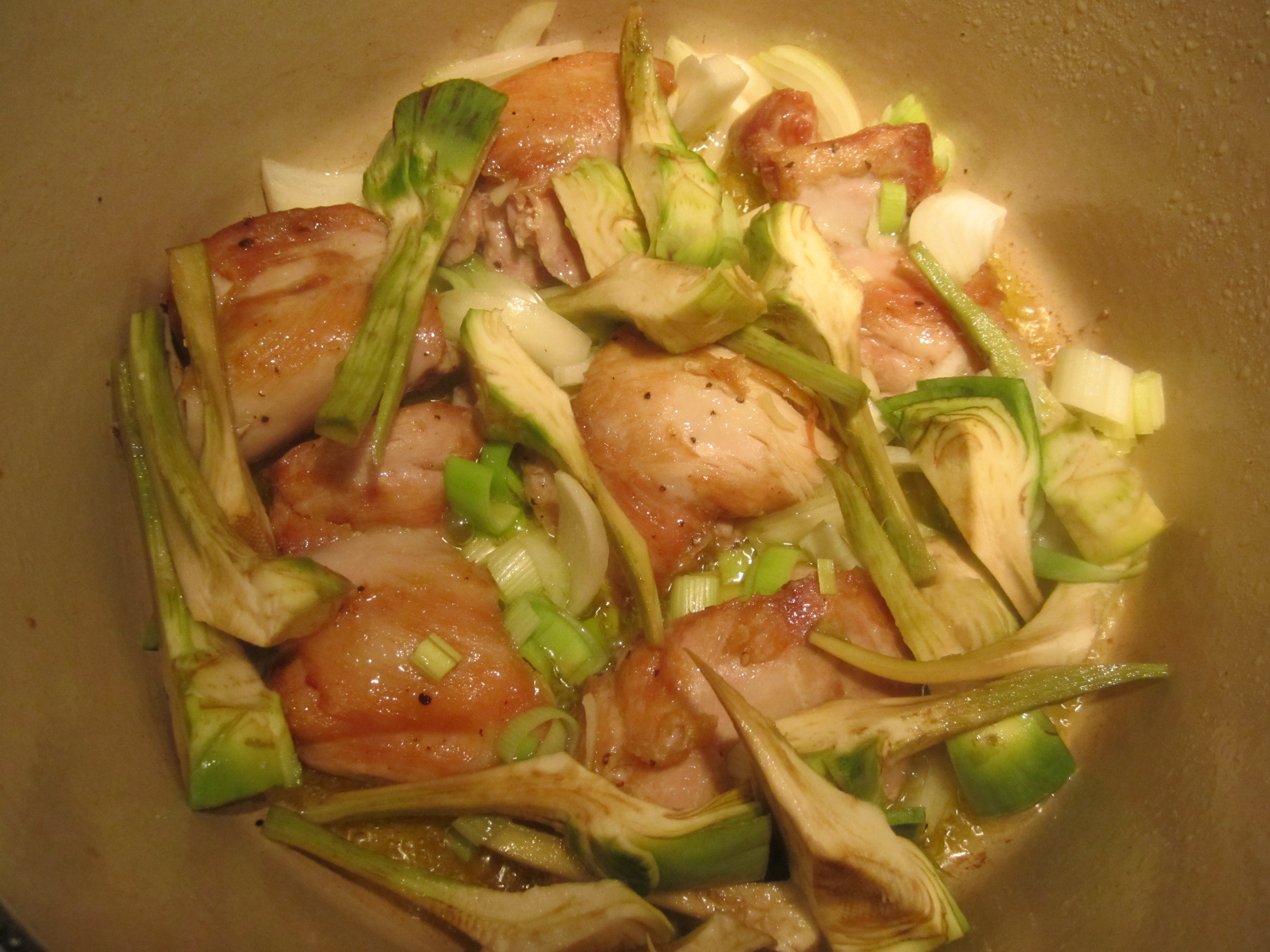 Today, in my Southampton market, the (California) artichokes looked great, so I decided to make a stew with white wine and fresh tomato–both flavors which accentuate the wonderful acidity of the artichoke. To anchor this spring stew, instead of the traditional lamb, I decided to use chicken thighs. Chicken and artichokes are a great combination–and chicken is lighter and quicker to cook than lamb stew.